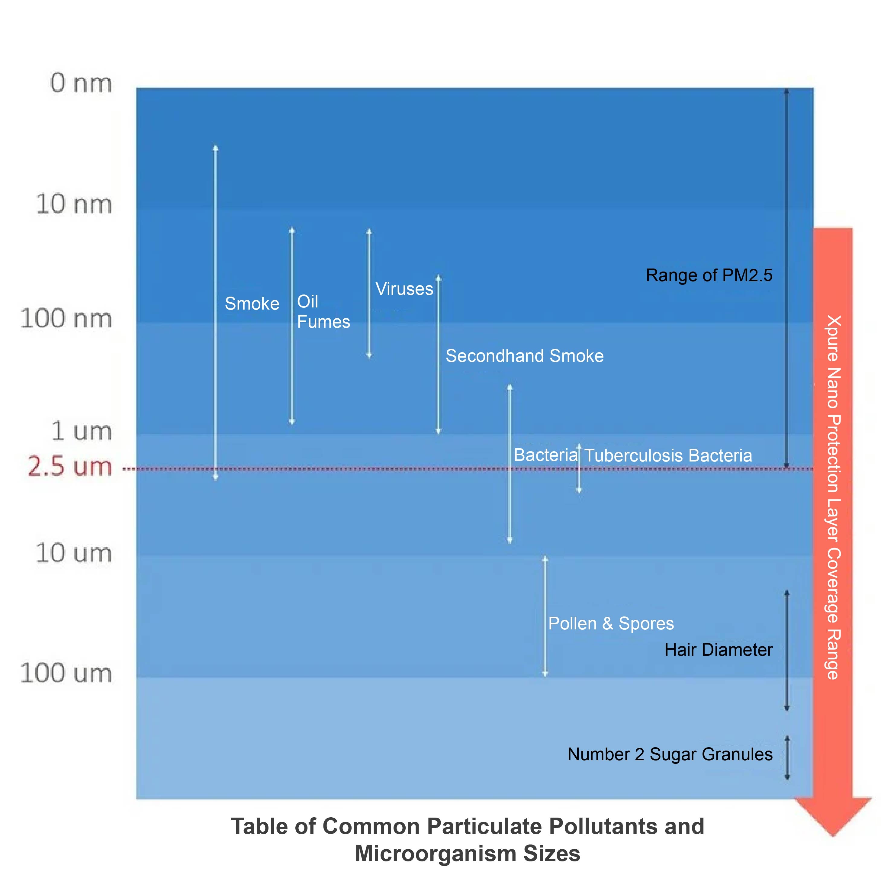 Since there is currently no clear specification in the world to define what "effective anti-PM2.5" is, and there is no lower limit on the size of PM2.5 (as long as it is less than 2.5 microns, even pollutants as small as radiation dust are considered within it). Therefore, we conducted a full-range particle size scan based on the maximum particle size of existing machines to faithfully present the filtration capabilities of [Xpure Nano Protective Layer] for consumers’ reference and choice.