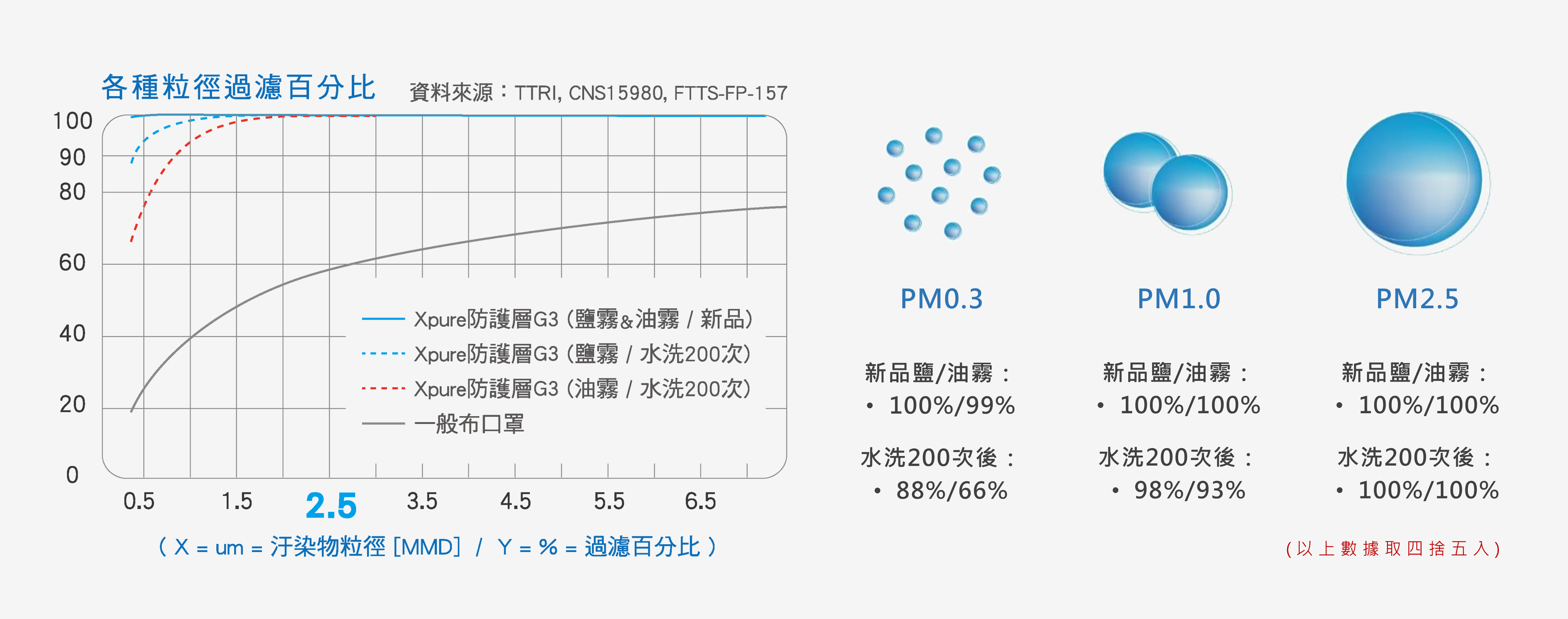Taking Xpure Nano Protective Layer G2 as an example, after cleaning 200 times, the filtration efficiency of PM0.3 dropped to about 80%, PM1.0 was still about 97%, and PM2.5 remained above 99%. Therefore, in fact, it is not that it will be completely ineffective after 200 times of washing. The reduction in filtration efficiency is gradual and slow. Instead, after 200 times of washing, the protective power will drop to the lower limit of the national anti-haze standard (CNS15980 new B level). At this time, there will still be a certain level of protection. However, it is still recommended to replace it with a new one to ensure the quality of breathing.