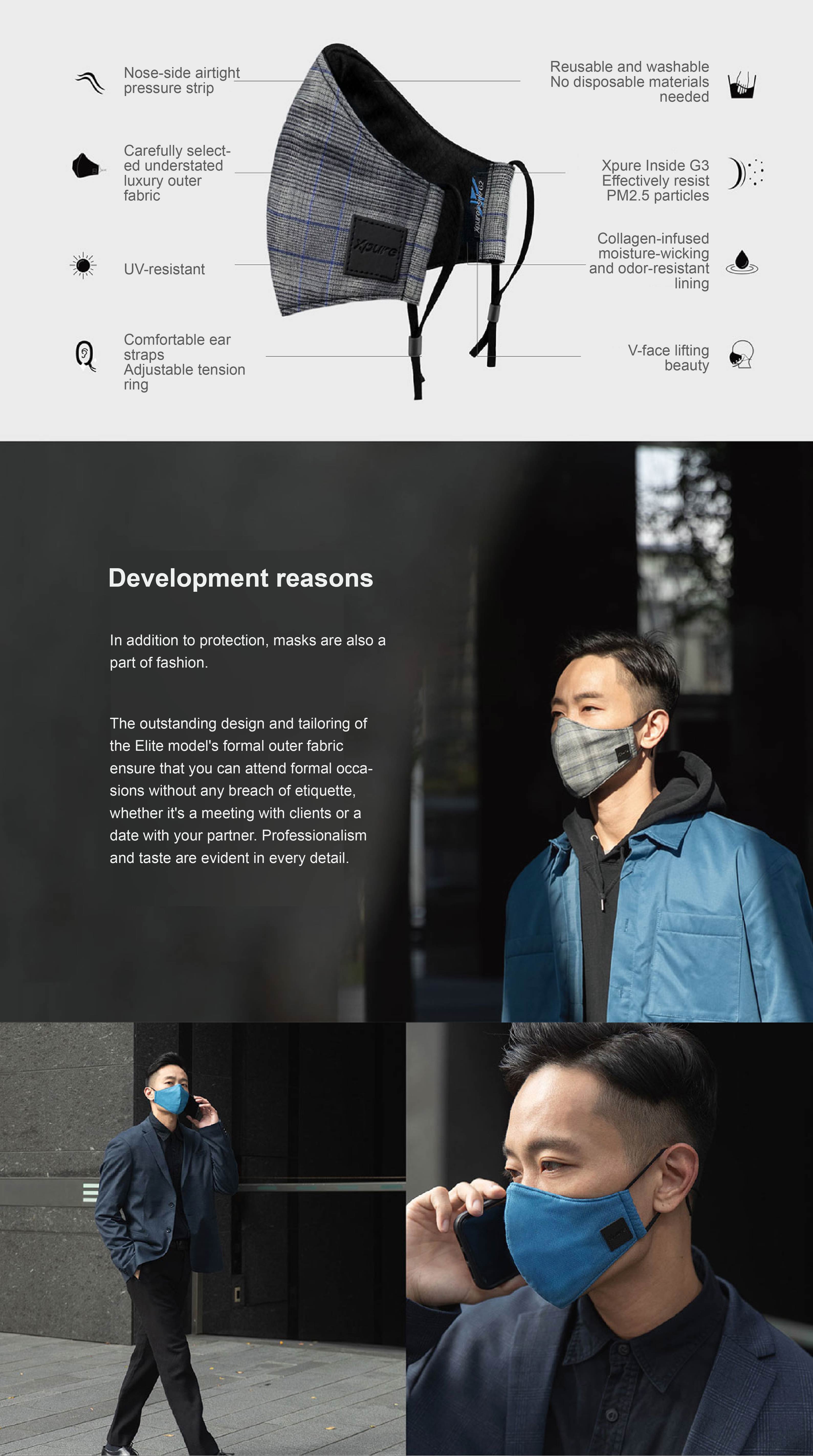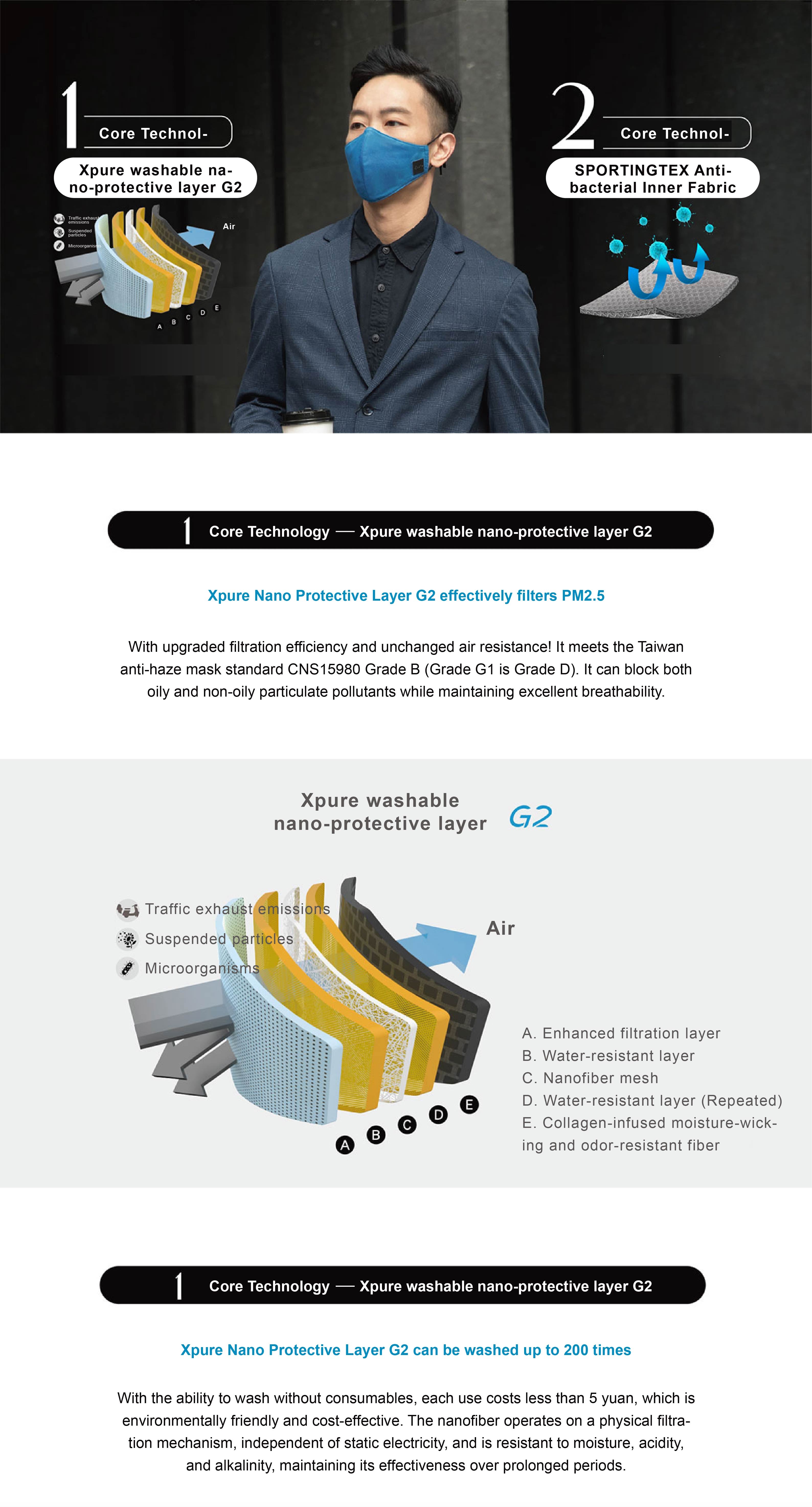 The Elite model belongs to Xpure inside G2 filter material, so it has the same level of filtration efficiency as the All-fit model, Beauty model, and Urban model of net convection. They can effectively filter PM2.5, reaching CNS15980 national anti-haze standard level B, and can It can be washed repeatedly 200 times and still maintains good performance. It is environmentally friendly and requires no consumables. It not only protects itself, but also reduces environmental pollution.