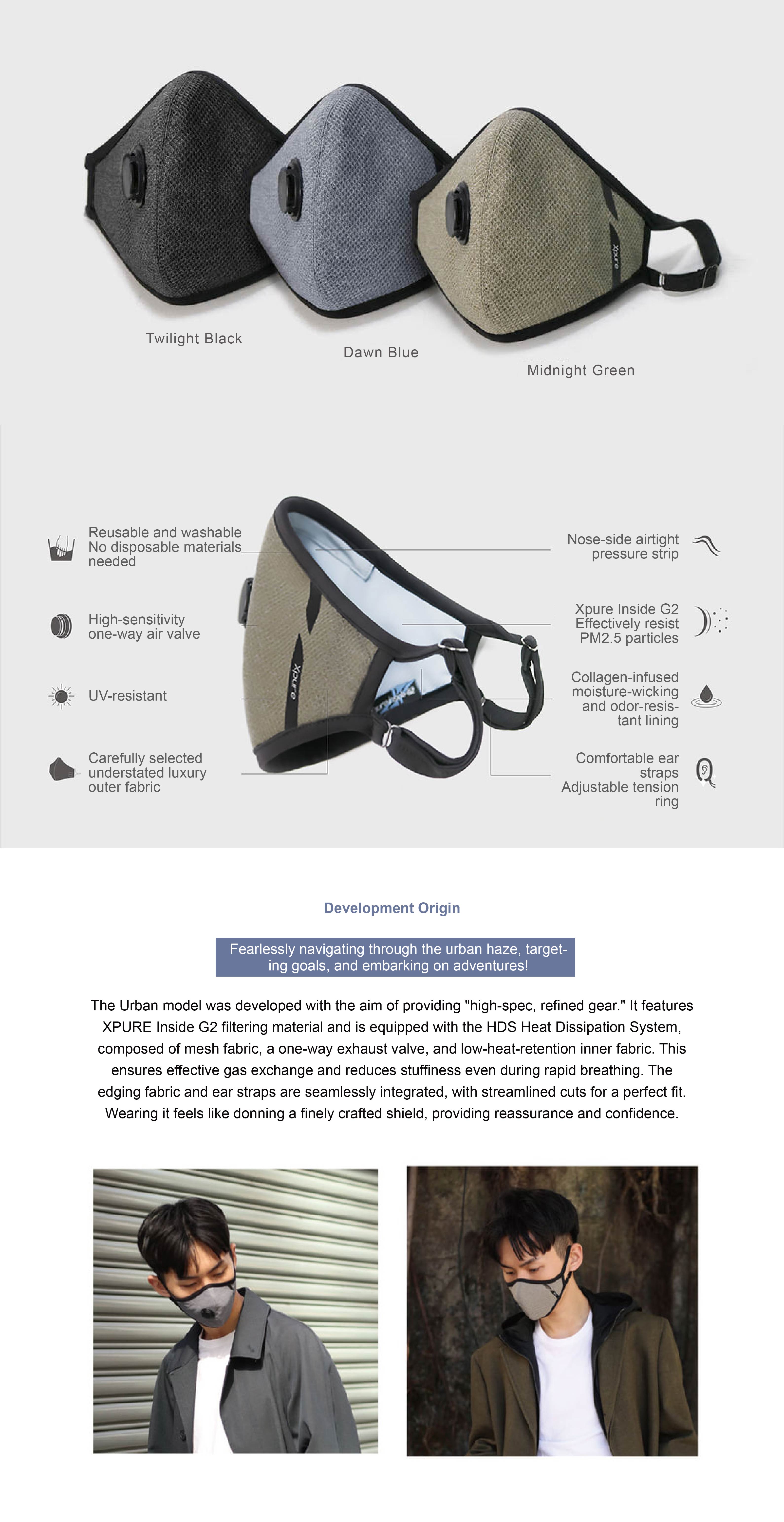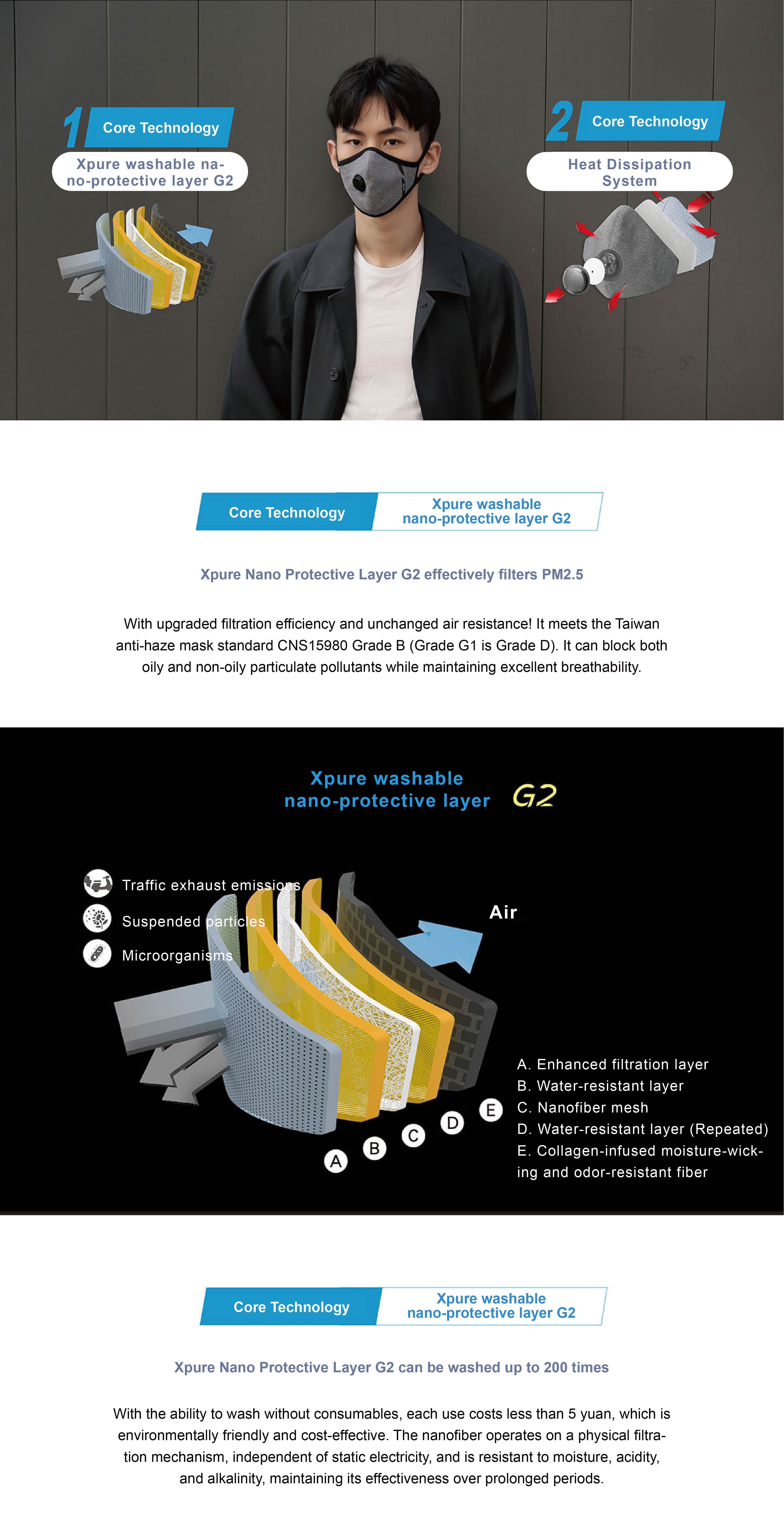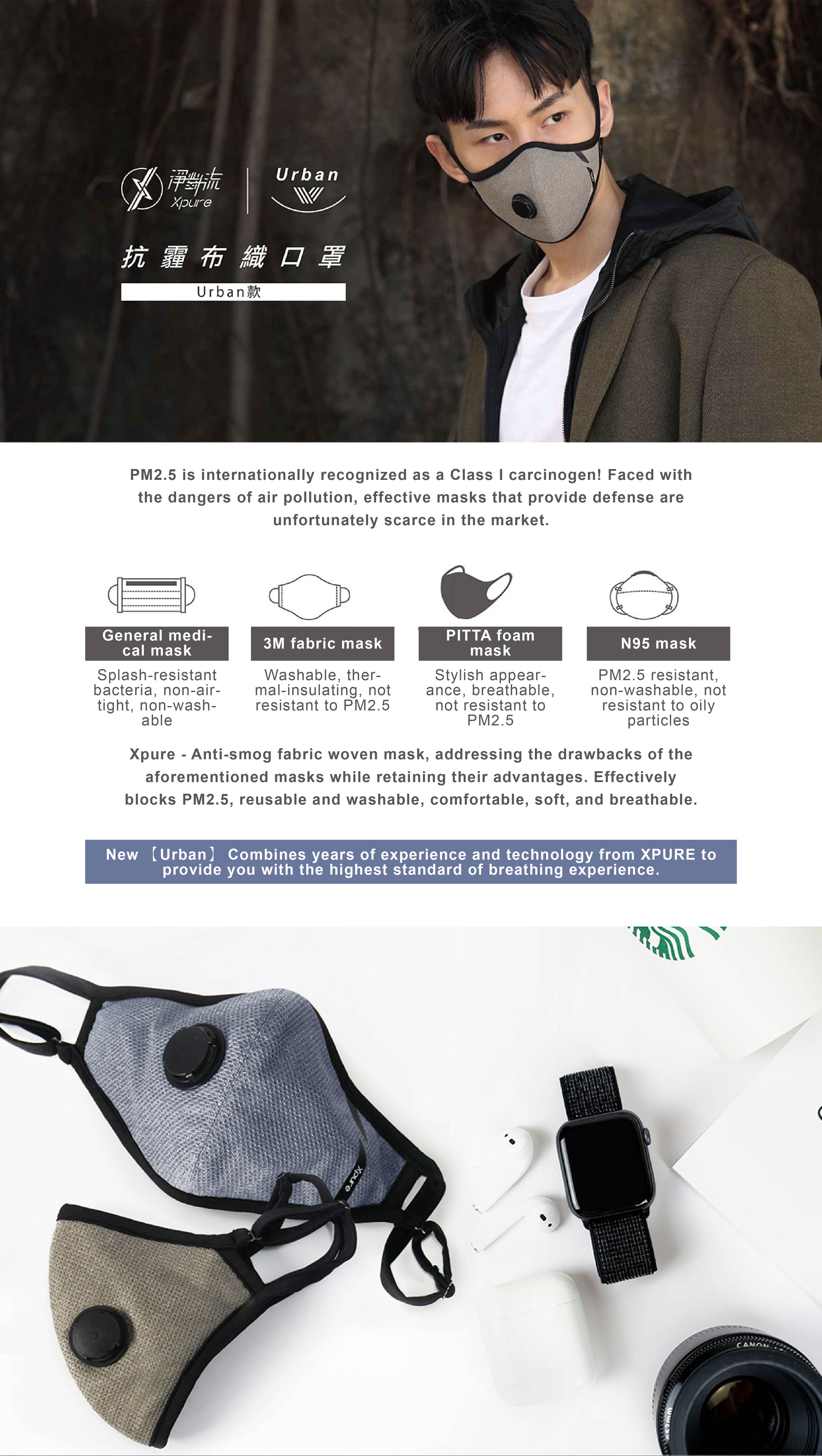 The Urban model, All-fit model and Beauty model use the same Xpue nano protective layer G2, which all pass CNS15980 B level, so the filtration effect is the same, and of course they can also withstand 200 times of water washing! The basic model uses G1 filter material, which passes CNS15980 D level. It has a slightly inferior protective effect, but it is sufficient for use in general environments.
