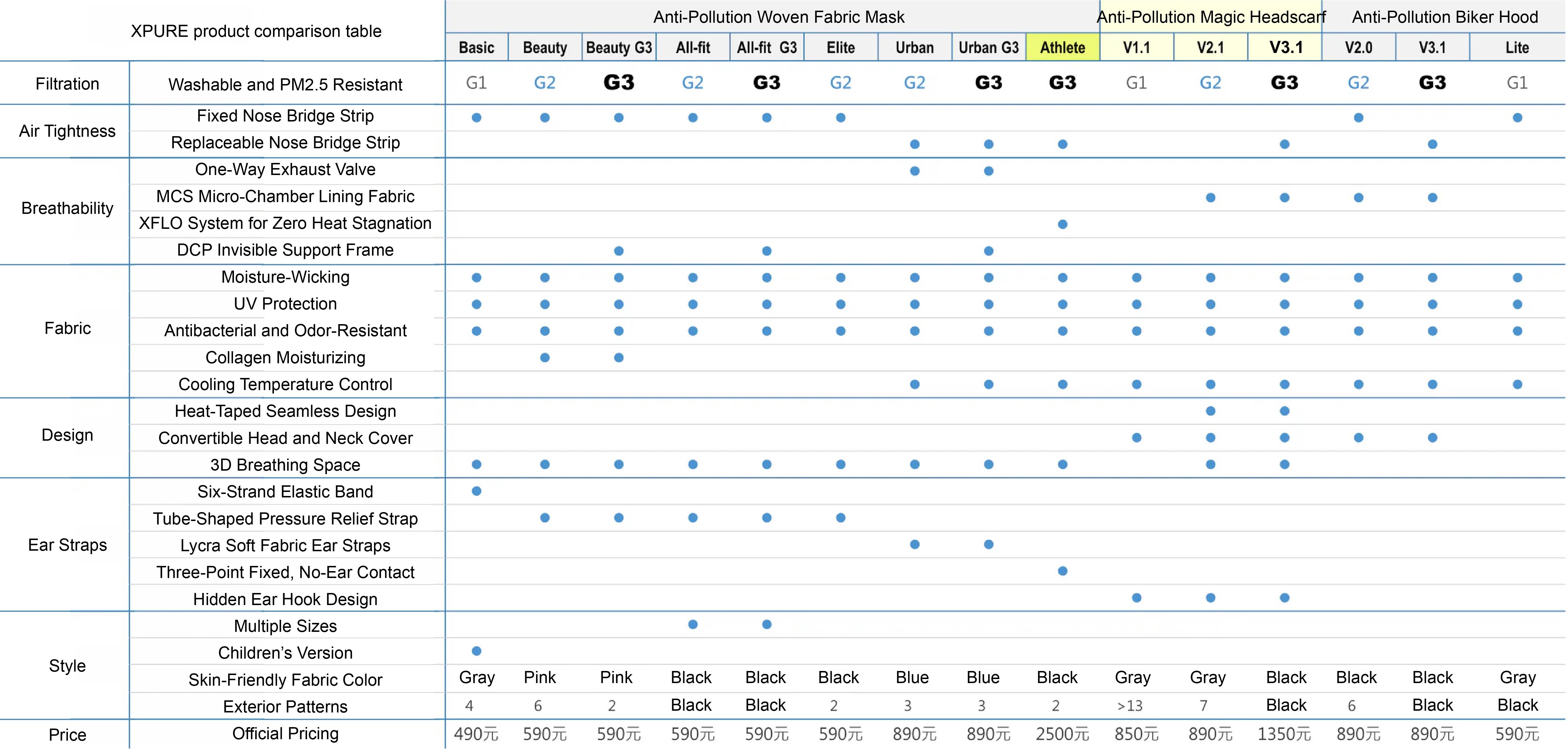 Comparison table of net convection textile anti-haze products
