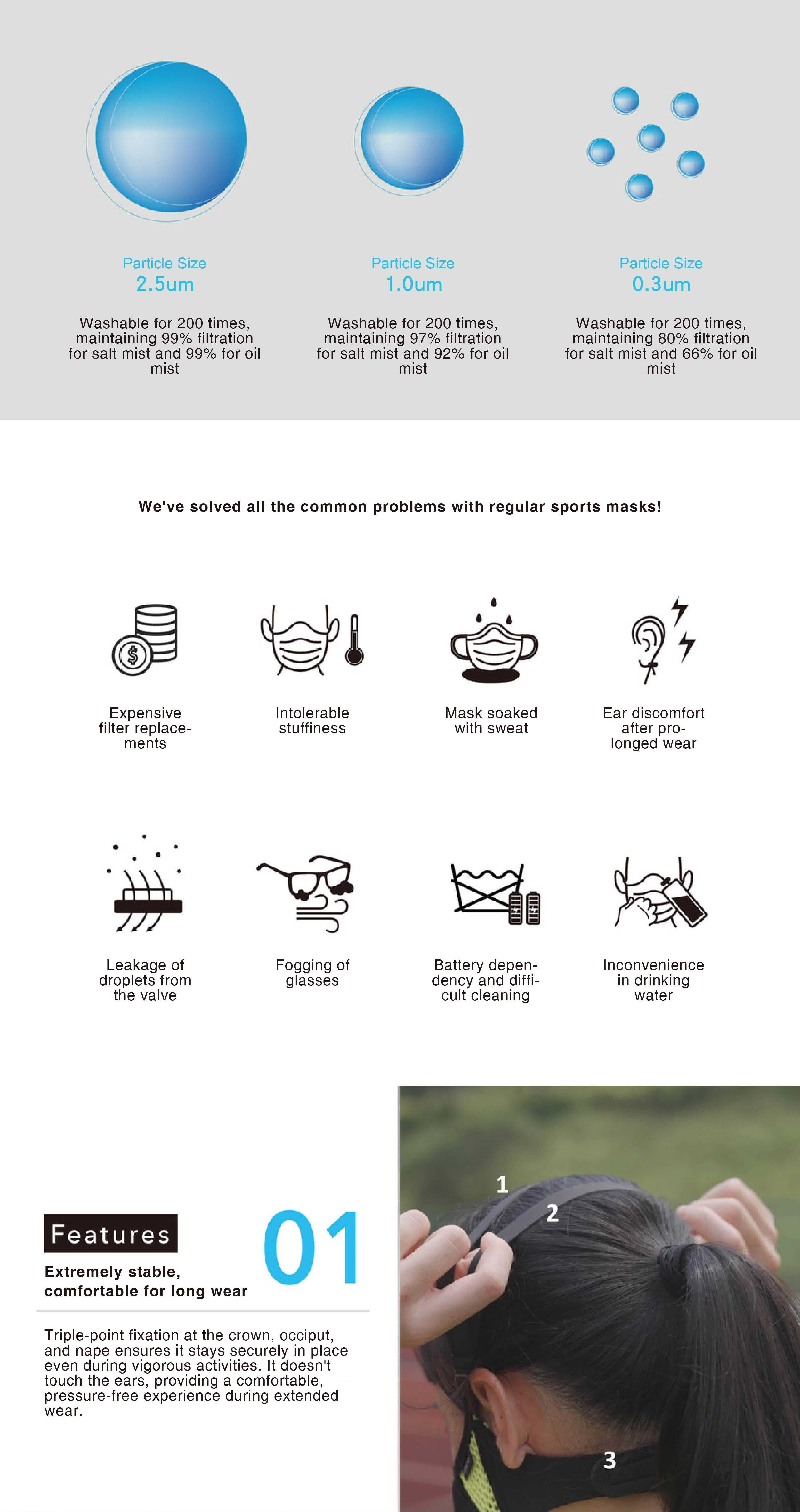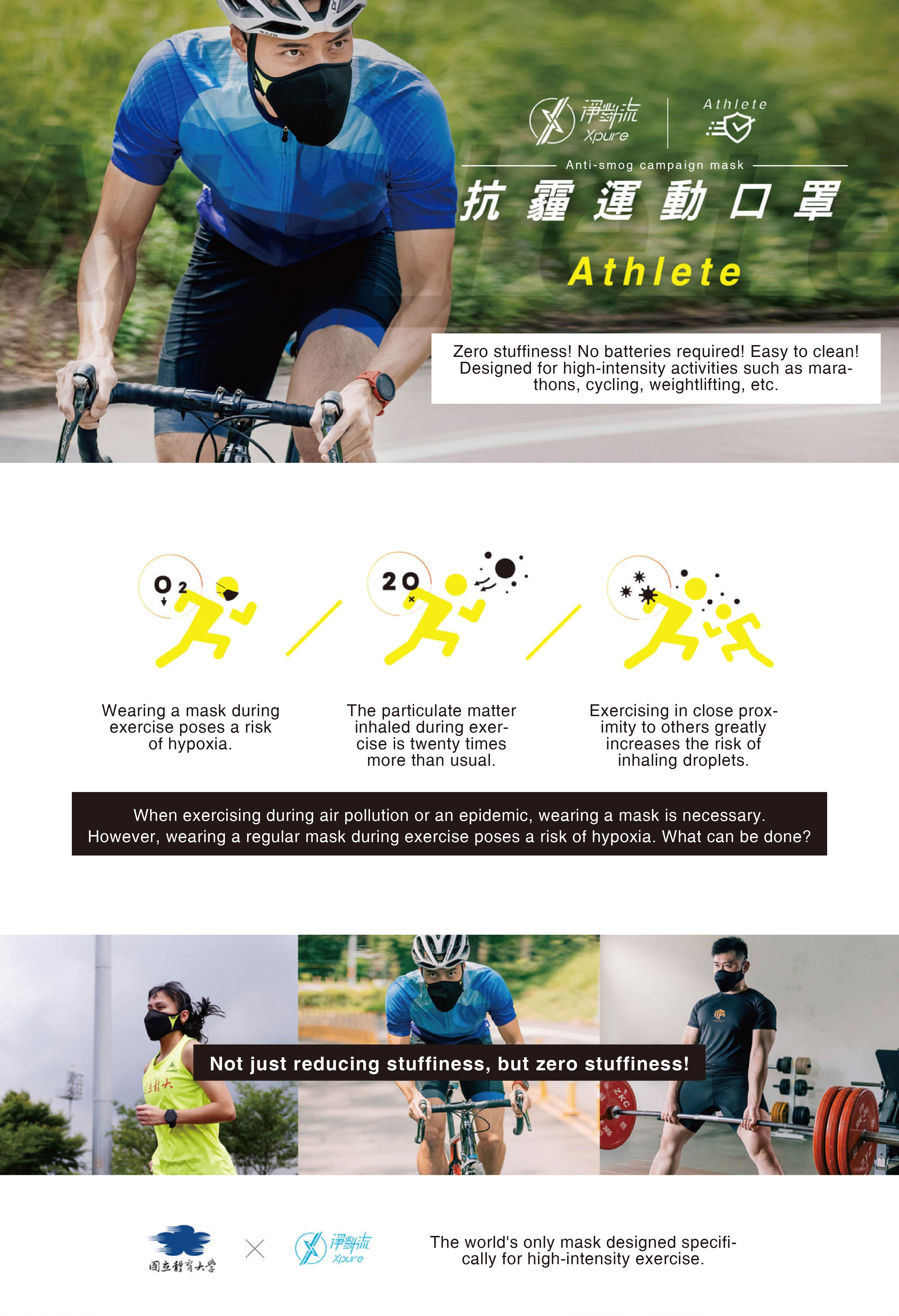 The Athlete model belongs to the Xpure inside G3 filter material. It is the latest version of the filter material. Compared with the net convection All-fit model, Beauty model, Urban model, and Elite model G2 filter media, it has better filtration efficiency, more resistance to water washing, and breathability. Lower impedance, thinner thickness, etc. It meets the CNS15980 national anti-haze standard and is newly manufactured to Grade A, and has passed the highest level of the American ASTM medical mask standard. It can be washed repeatedly 200 times and still maintains good performance. It is environmentally friendly and has no consumables. It not only protects itself, but also reduces environmental pollution. ( Please click here to view the relevant inspection report of the filter material )