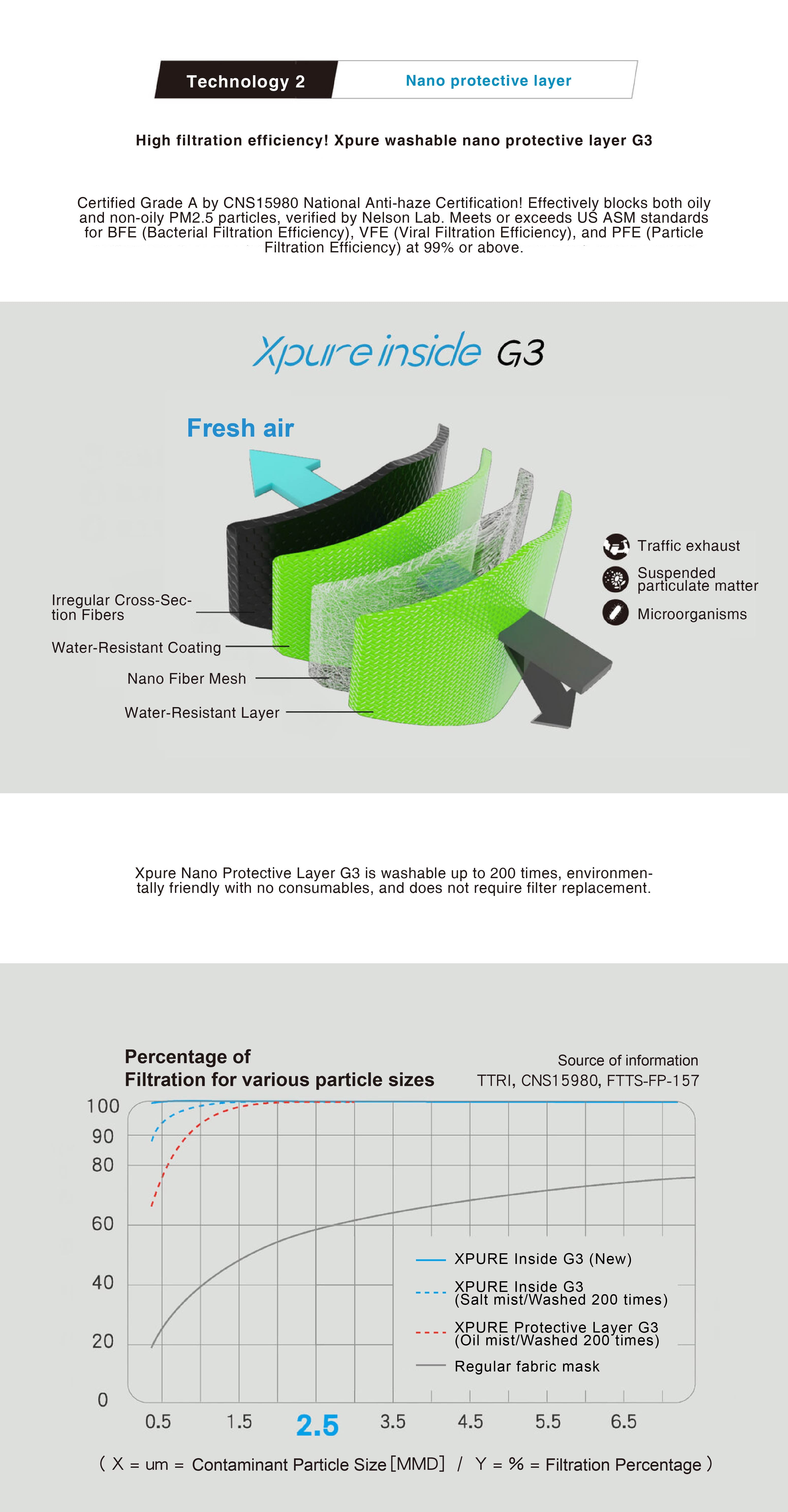 - Equipped with Xpure Inside G3 filter material, a patented N95 grade filter material that can be washed 200 times and does not need to be replaced.