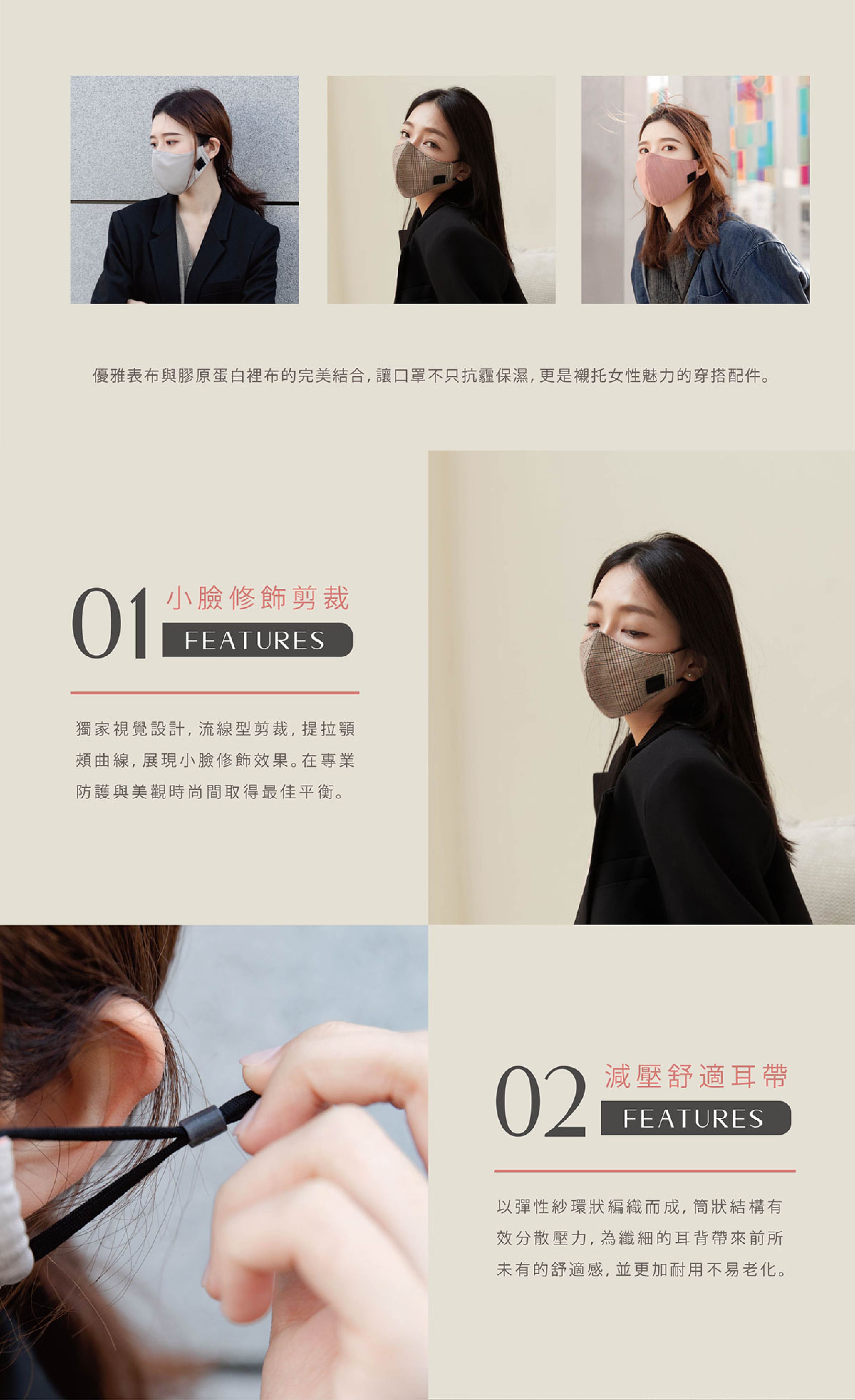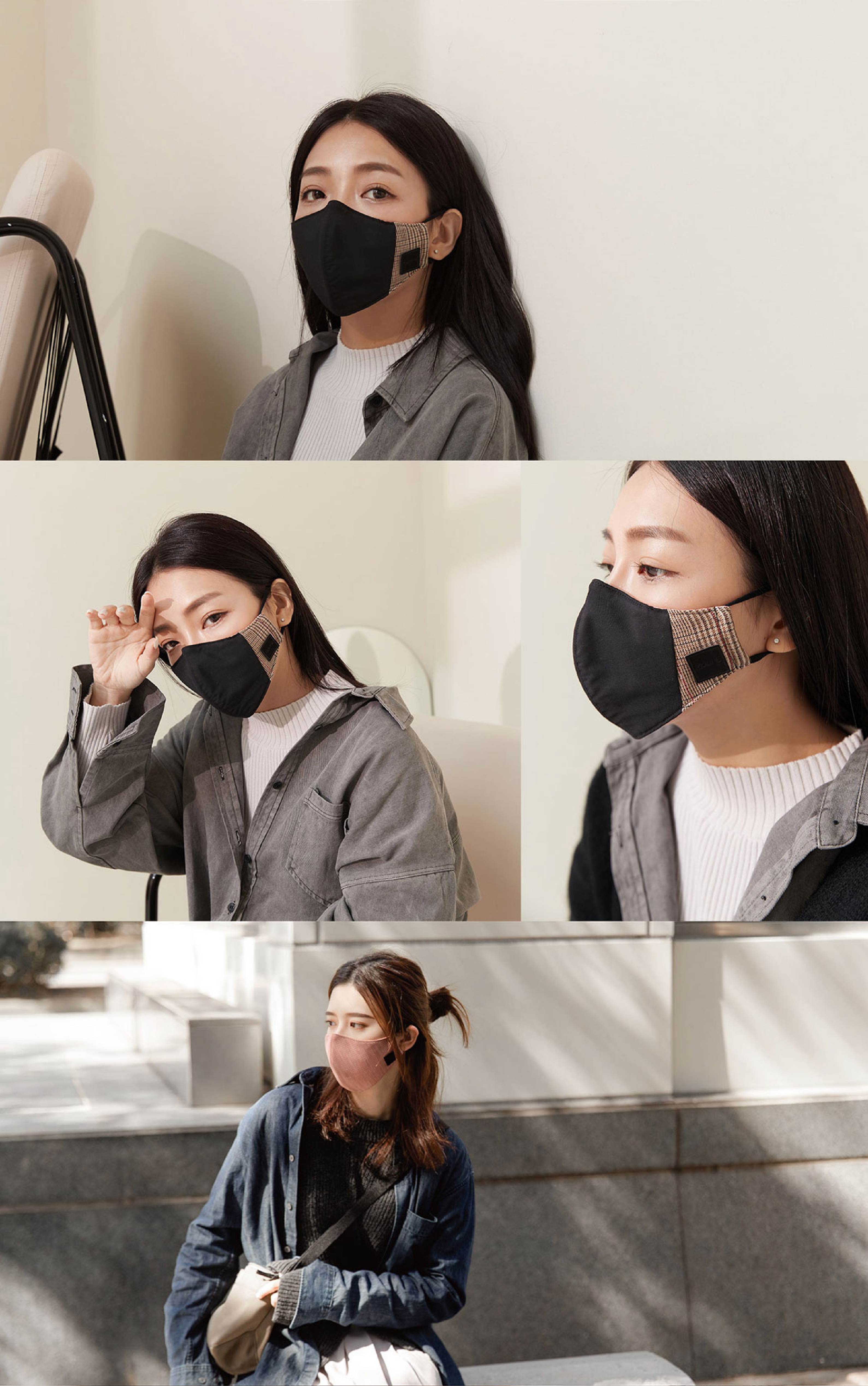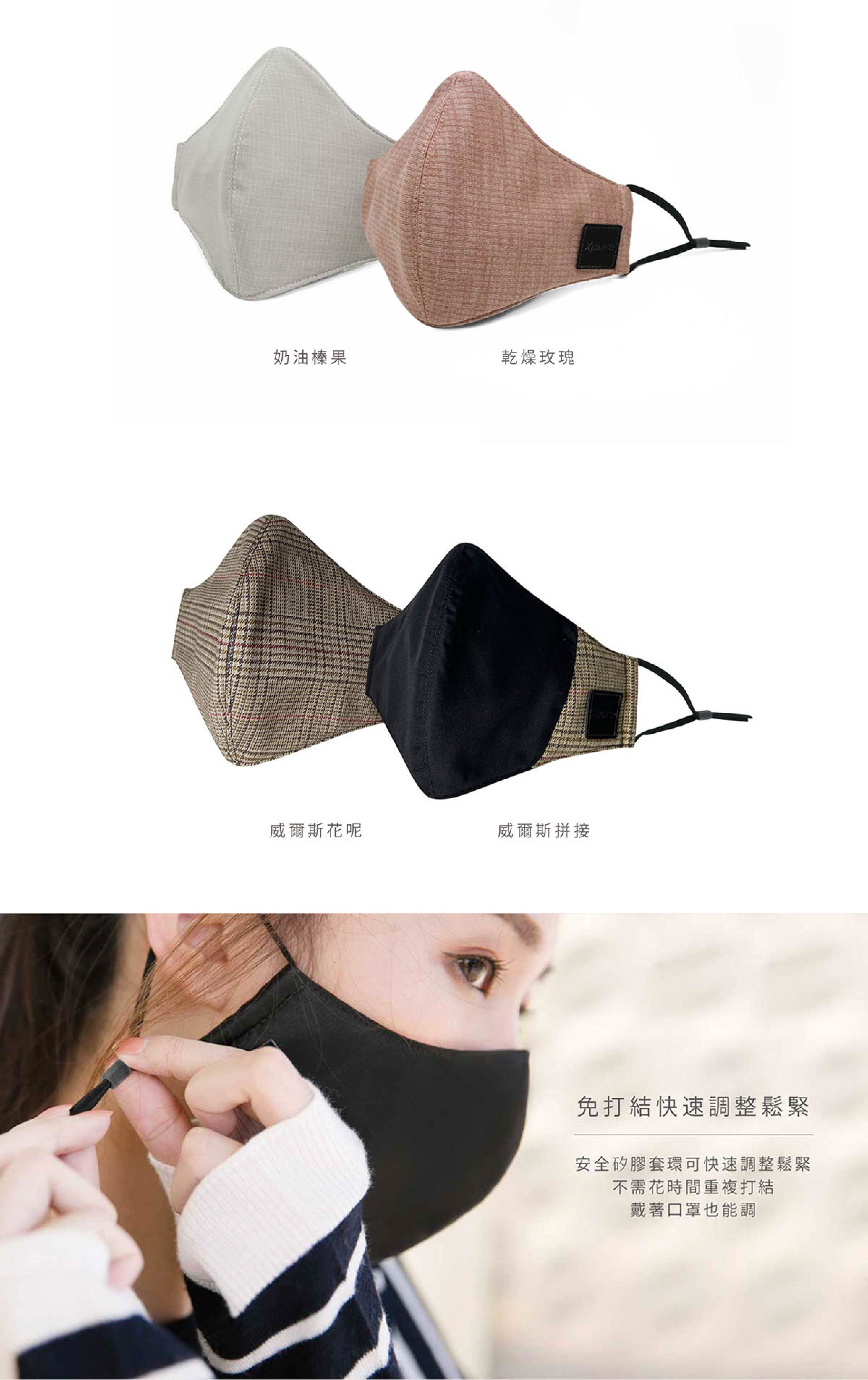 威爾斯花呢的表面布料採用100%純棉平織透氣表布,除了觸感極佳以外,呼吸體驗也提升許多。但要注意純棉材質清洗後晾乾時,需要拉整表面 (跟洗純棉襯衫一樣),這樣口罩晾乾後才能保持平整。或亦可使用熨斗低溫熨燙(建議100度C以下),讓表布迅速恢復平整。