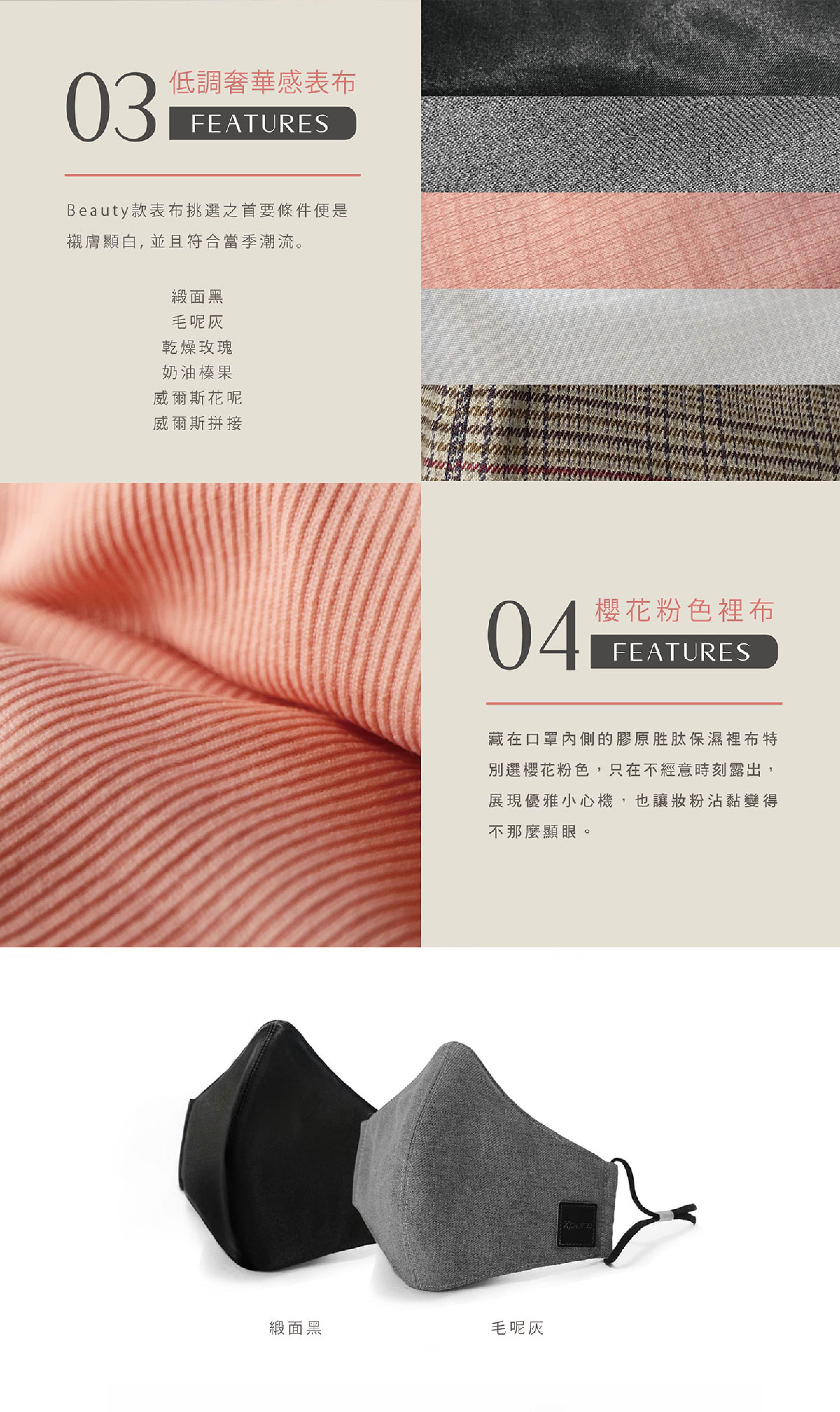 - 表布材質不同,一般款為斜紋布(分六種顏色),Beauty款則有四種:緞面黑、毛呢灰、乾燥玫瑰、奶油榛果