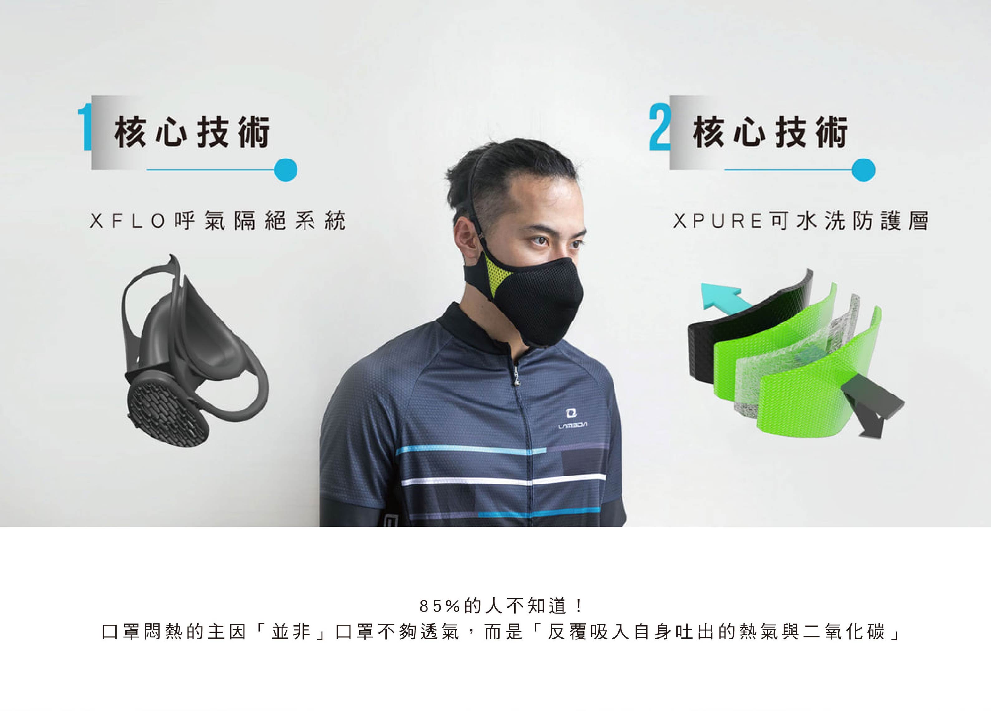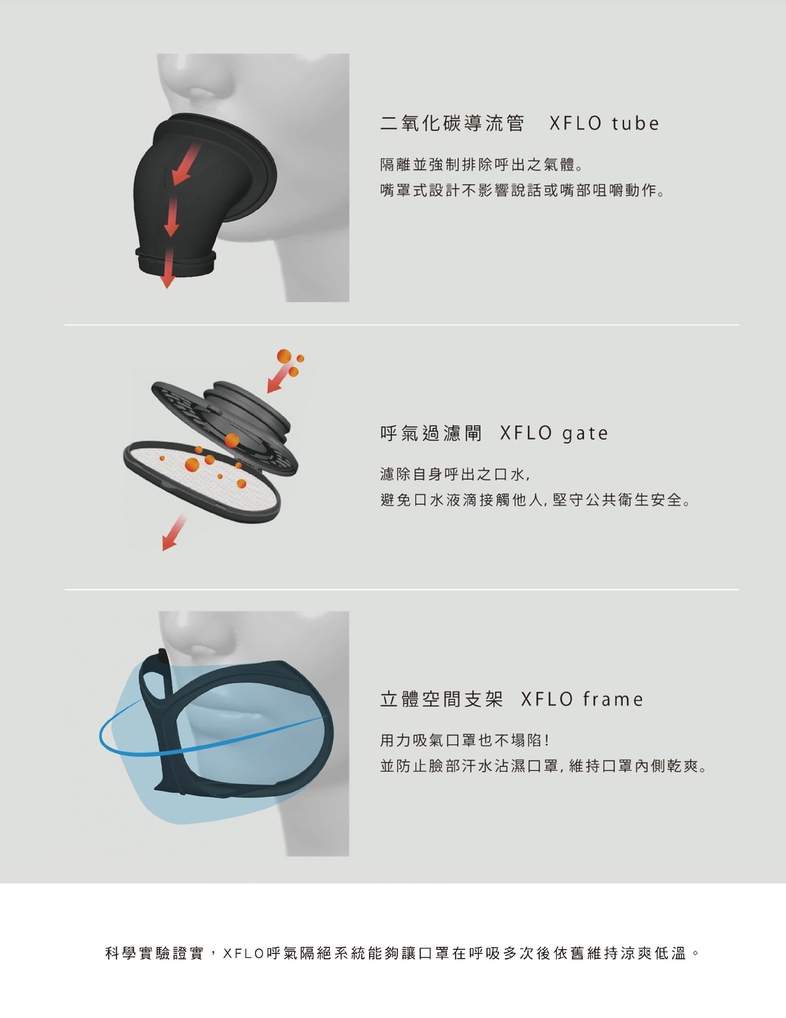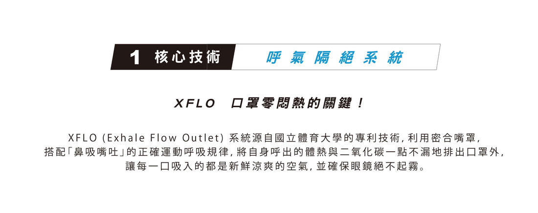 - 國體專利XFLO系統可完全阻隔呼出之熱氣與二氧化碳,達到世界唯一「零悶熱」效果!