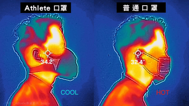 口說無憑,請參考文案中的熱像儀實驗影片,可以發現戴了Athlete口罩在呼吸多次後,依然維持比臉部皮膚溫度還低,而且是低很多的藍色!再看看影片中身體的衣服,會與皮膚溫度平衡而呈現體溫的橘紅色,但我們的口罩不會喔!簡單來說,Athlete口罩在配戴過程中,不會與體溫平衡,而是維持環境空氣的溫度,是相對涼爽的 (當然若環境空氣溫度已經高於體表溫度35度以上,則不管怎樣都還是會覺得熱喔...)。
