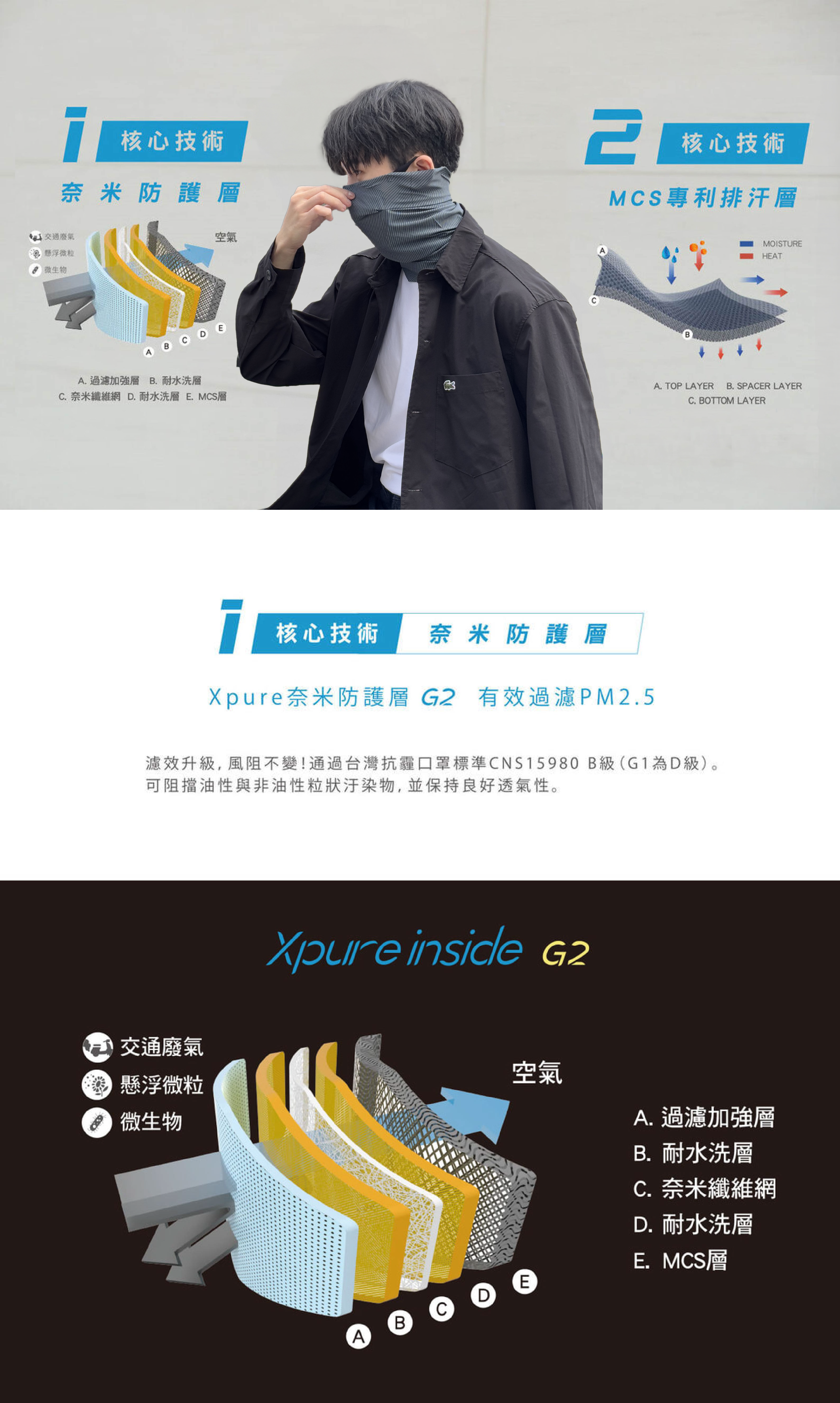 - Xpure奈米防護層為第二代,可通過CNS15980 B級 (G1為D級)。