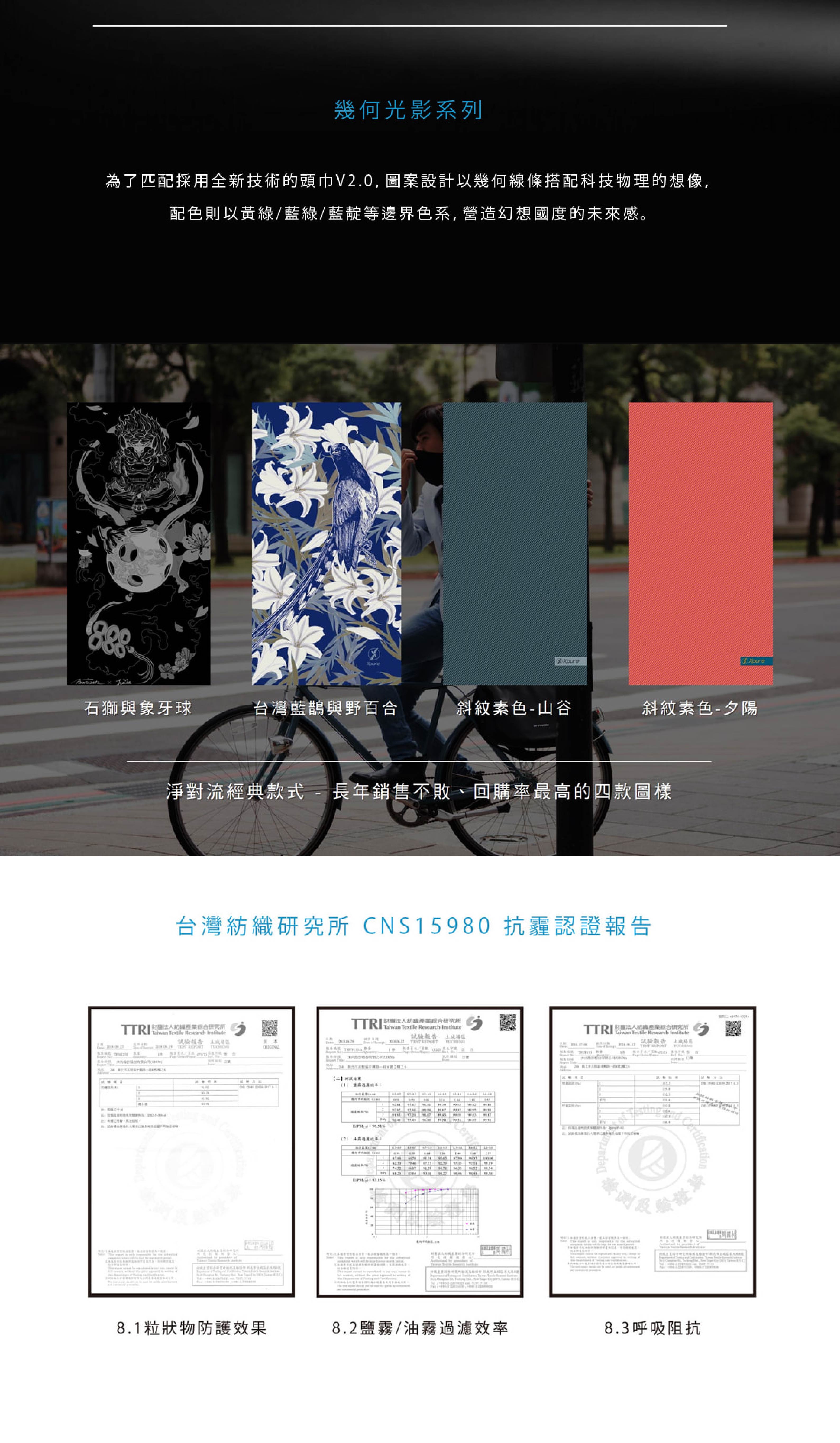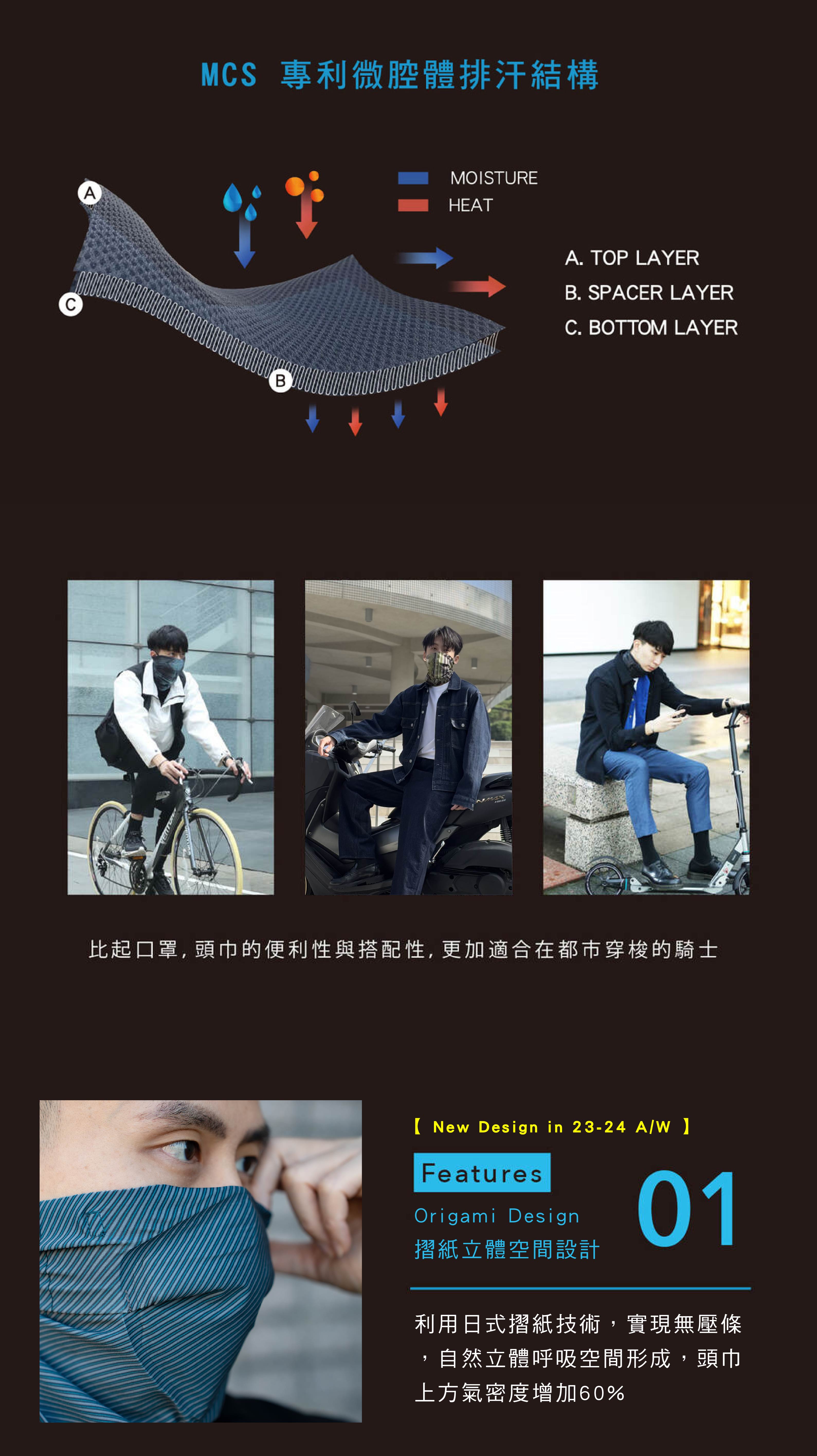 我們團隊中也有三鐵型的車手(擊掌~),他的答案是:「這款產品只適合有氧區間使用,在攻上坡或是全力拚秒數時,進氧量是一切!任何會犧牲到進氣的都給我滾開!但在下坡及平地,尤其是市區、工業區,或剛好在卡車後面,請拉上魔術頭巾保護一下珍貴的肺。」