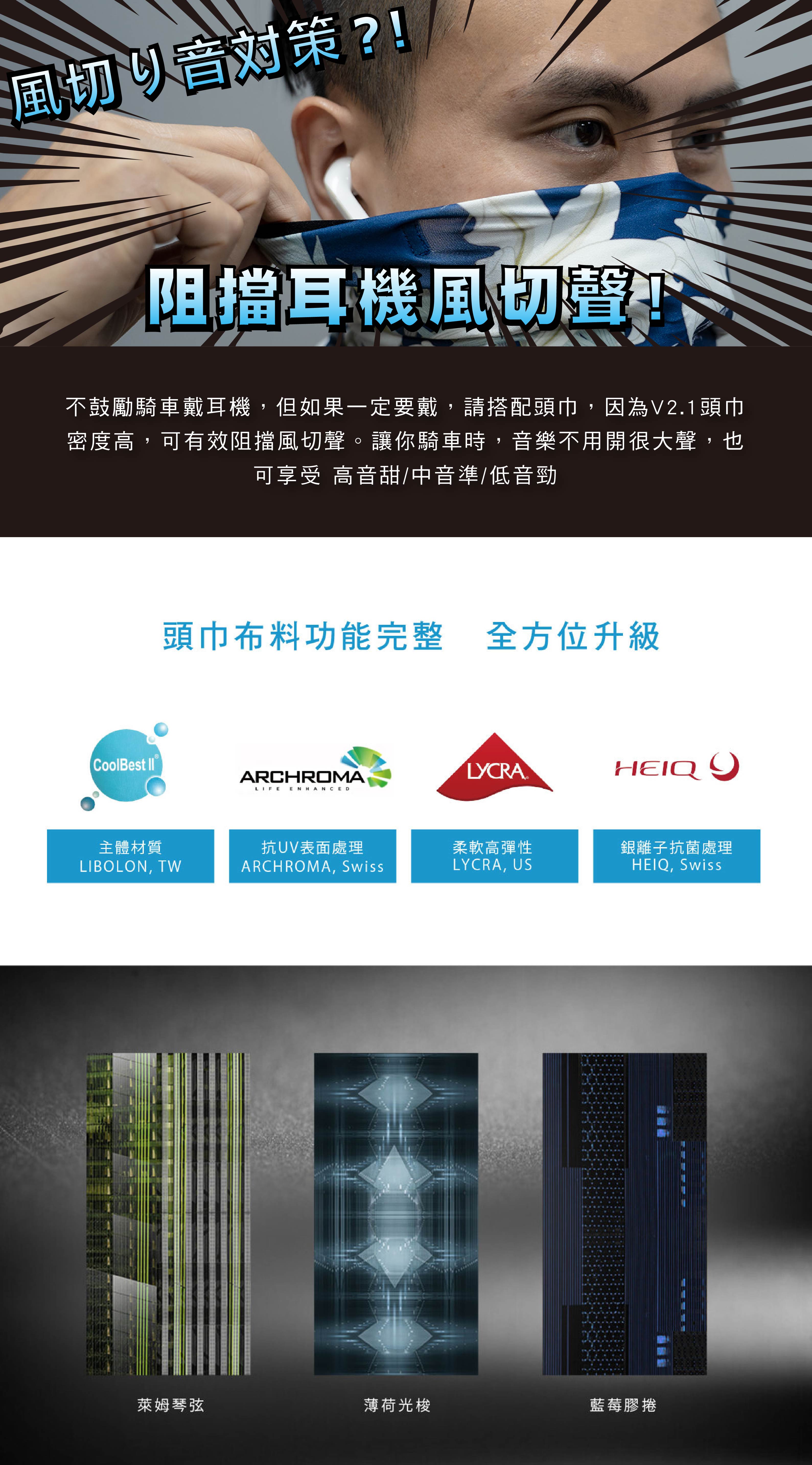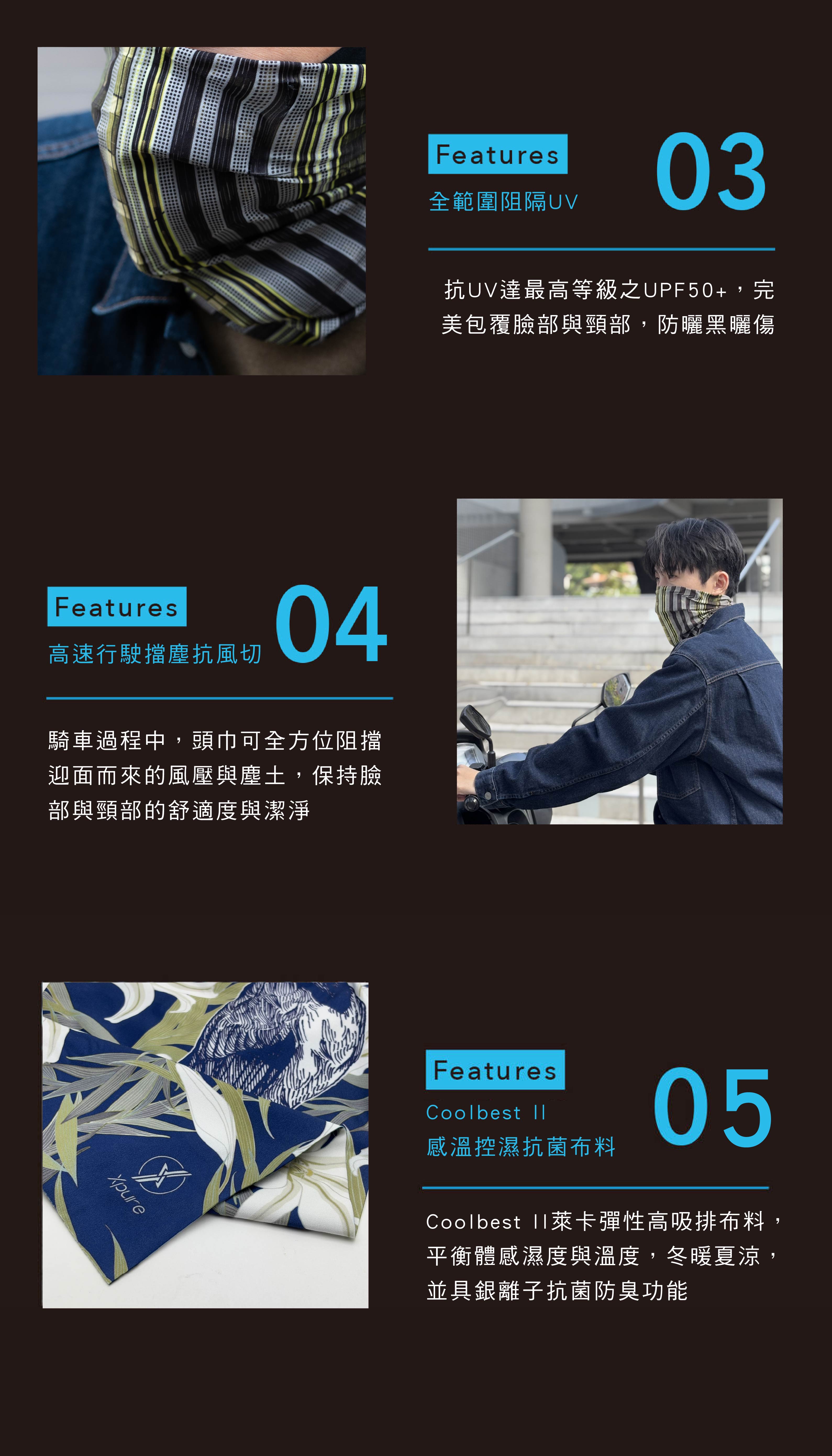 - 頭巾布料採用Coolbest II萊卡彈性布料,涼感舒適色澤飽滿。