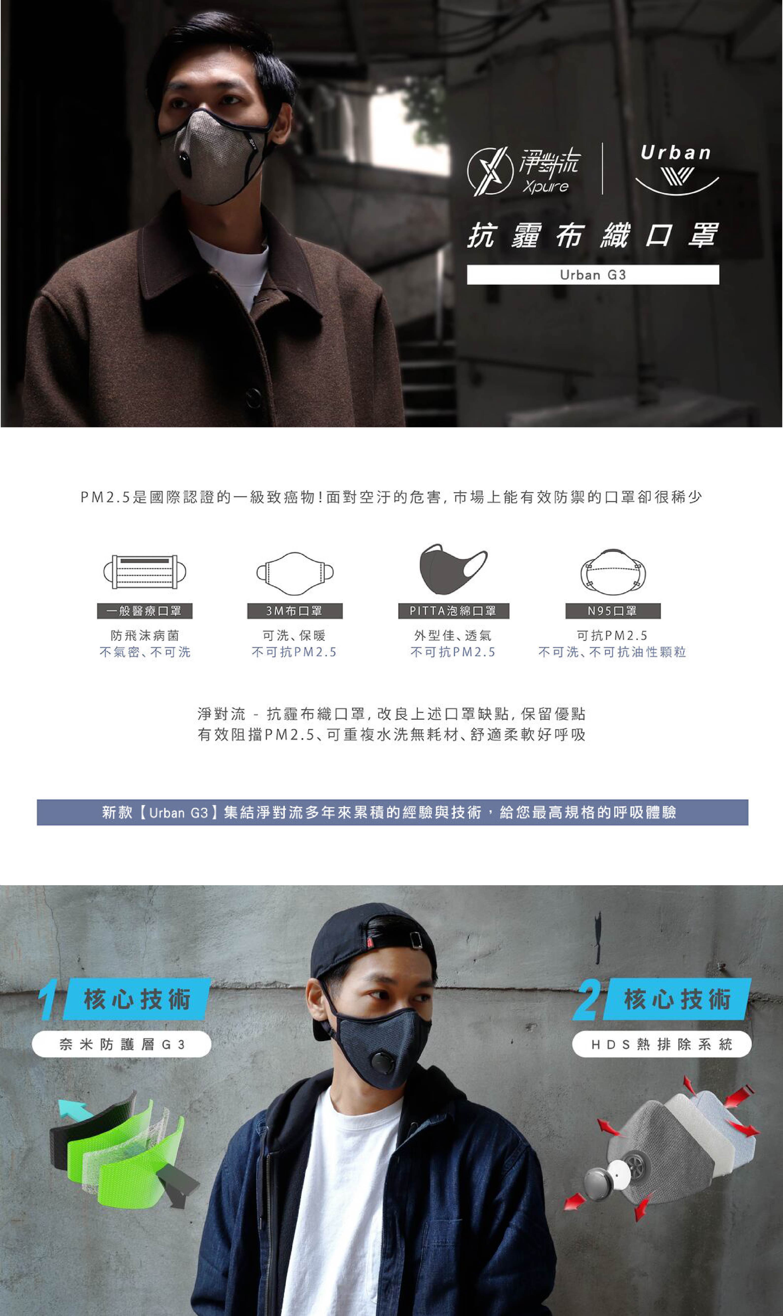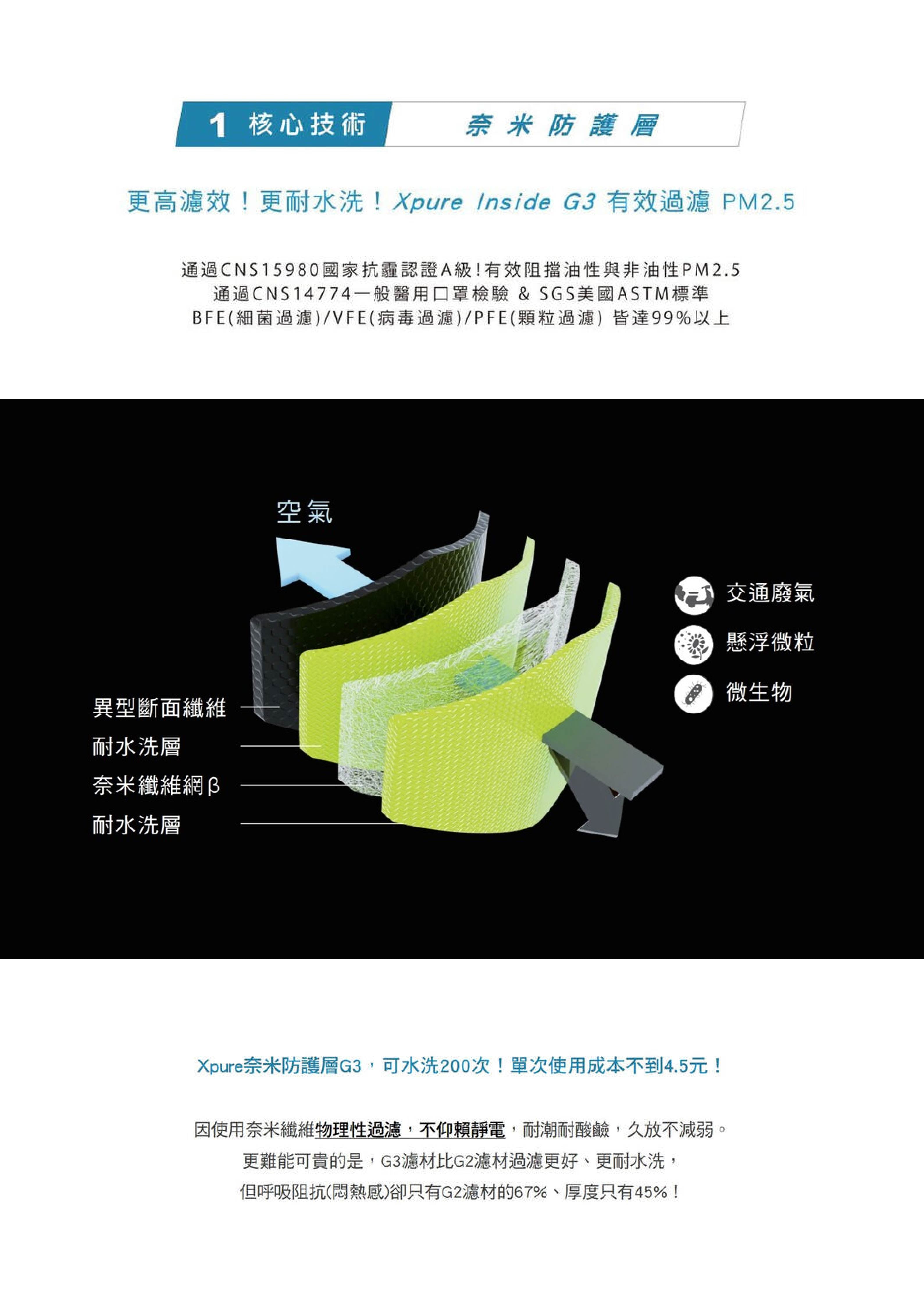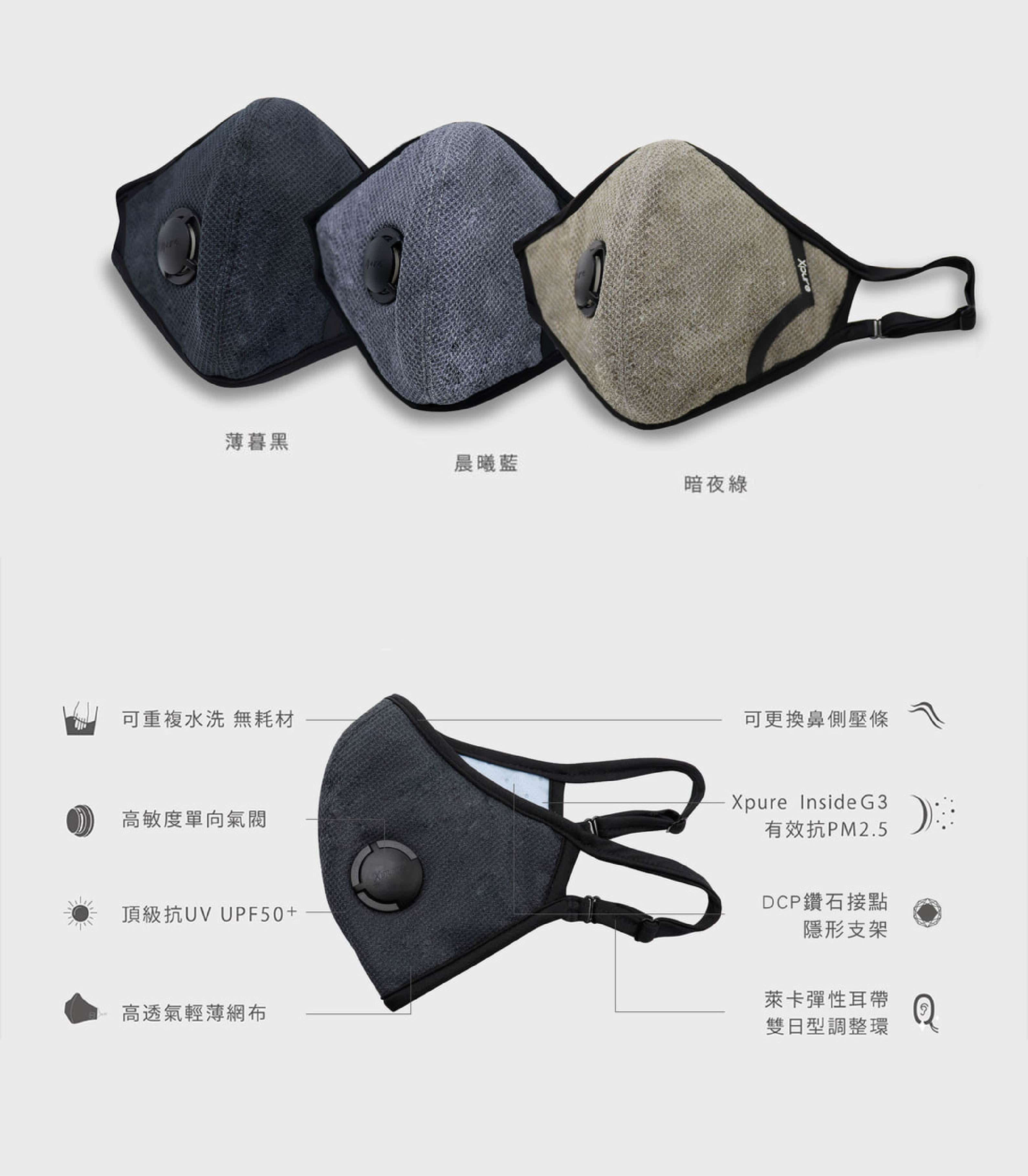 Urban G3、All-fit G3、Beauty G3、Athlete三款目前使用Xpure奈米防護層G3,過濾效果最高(CNS15980 A級),最耐水洗,並且有最低的呼吸阻抗。而其餘款式除了Basic款使用G1濾材,其餘皆使用Xpue奈米防護層G2,通過CNS15980 B級,過濾效果也是很好。另外,不論G1、G2、G3都同樣能承受水洗200次,並且在一般情境下使用都是很足夠的。