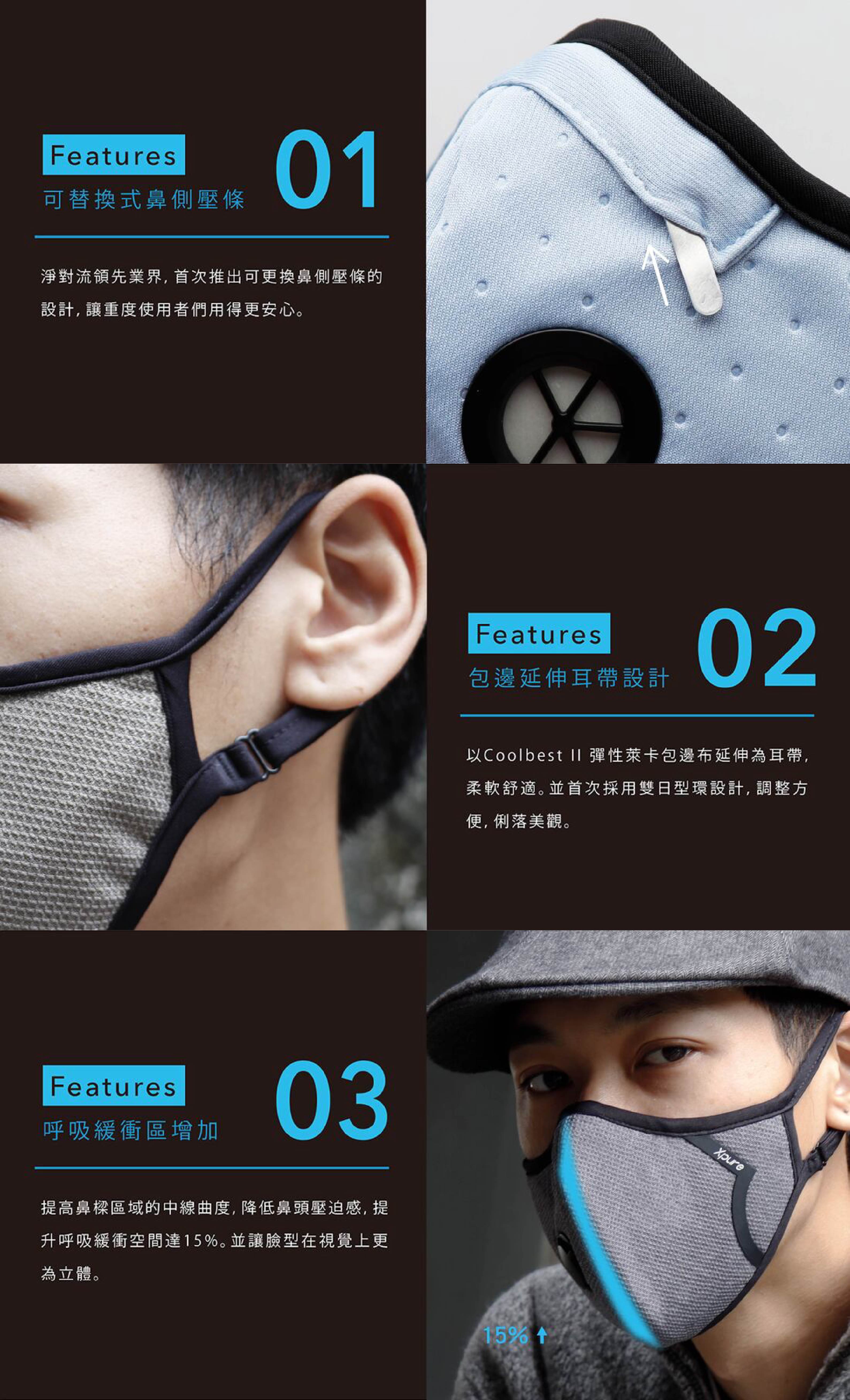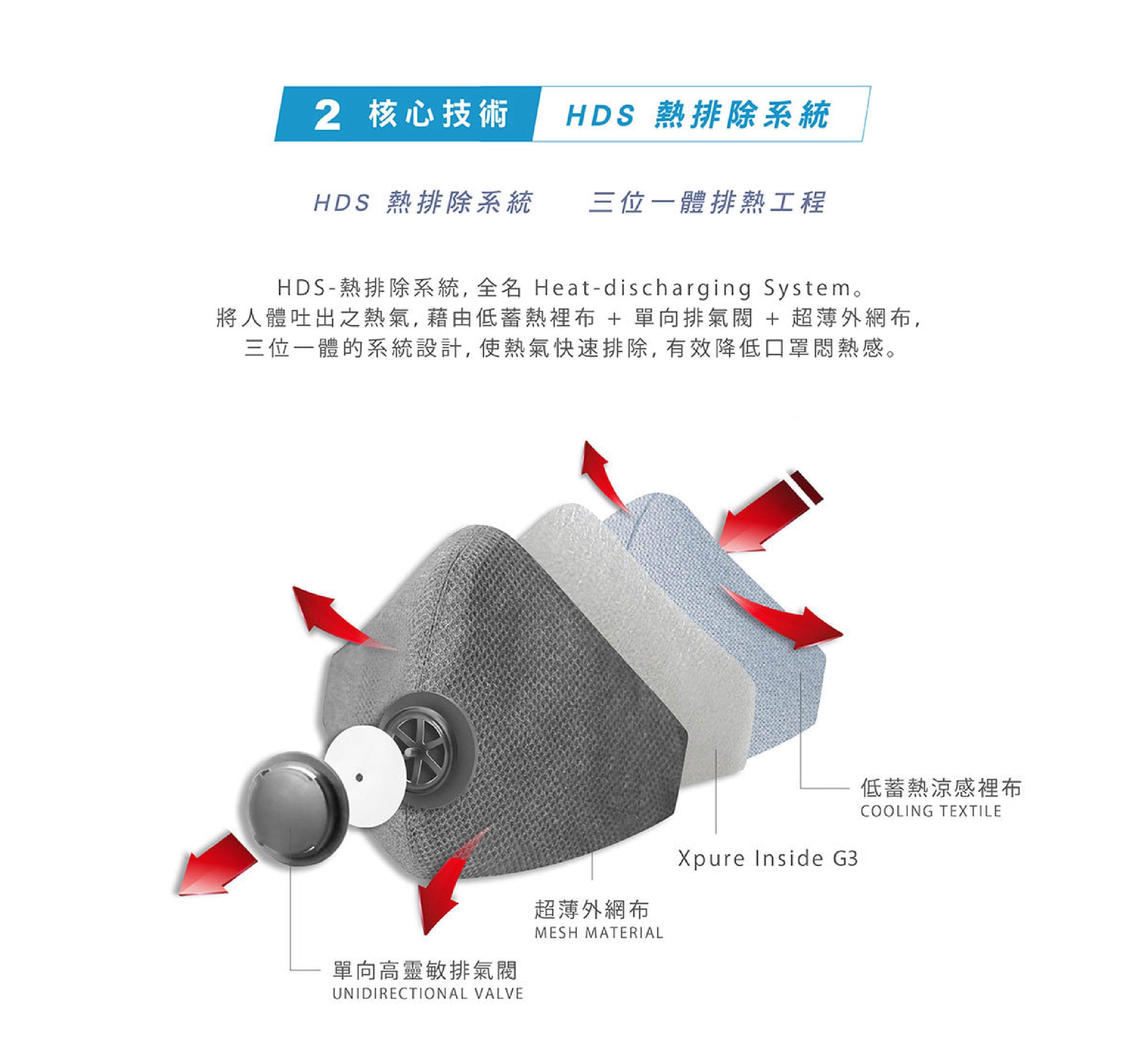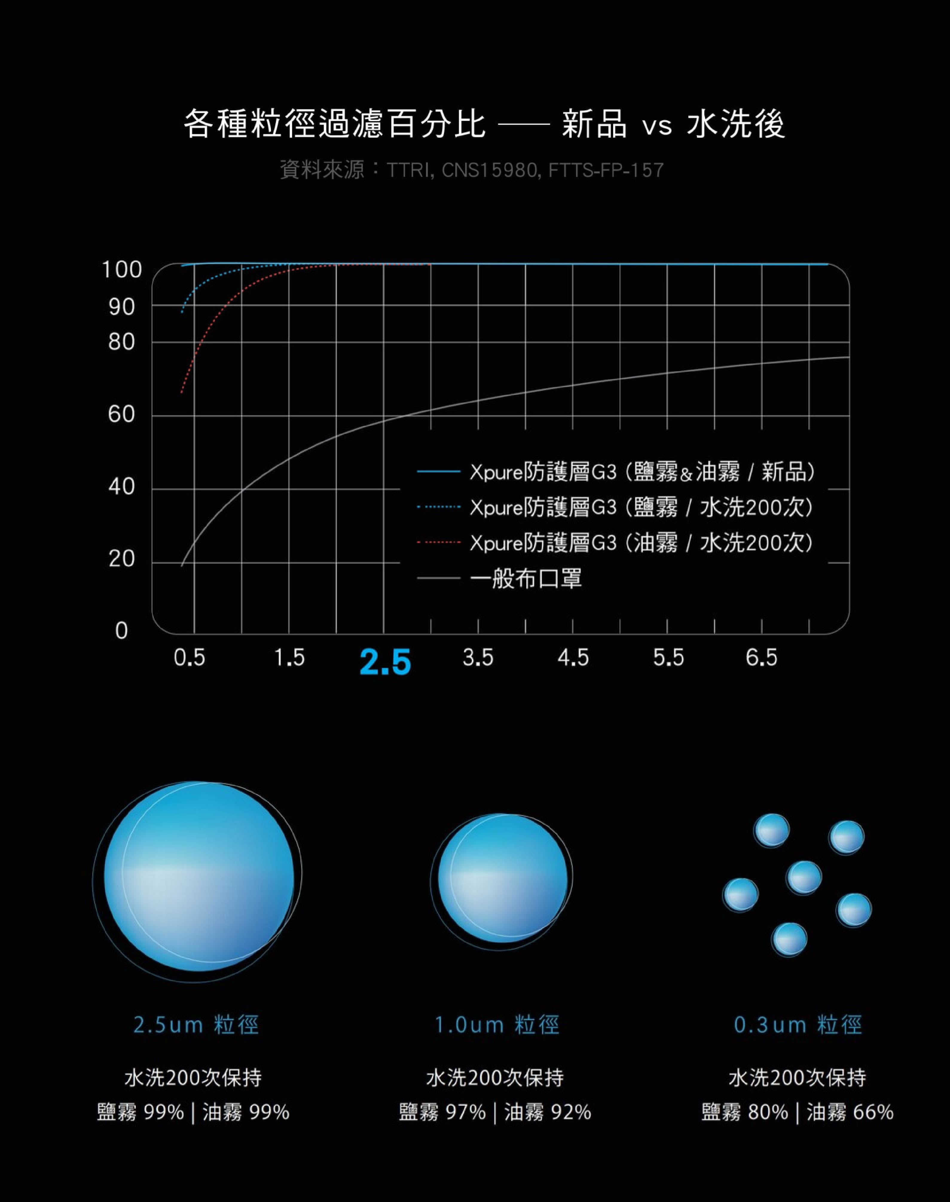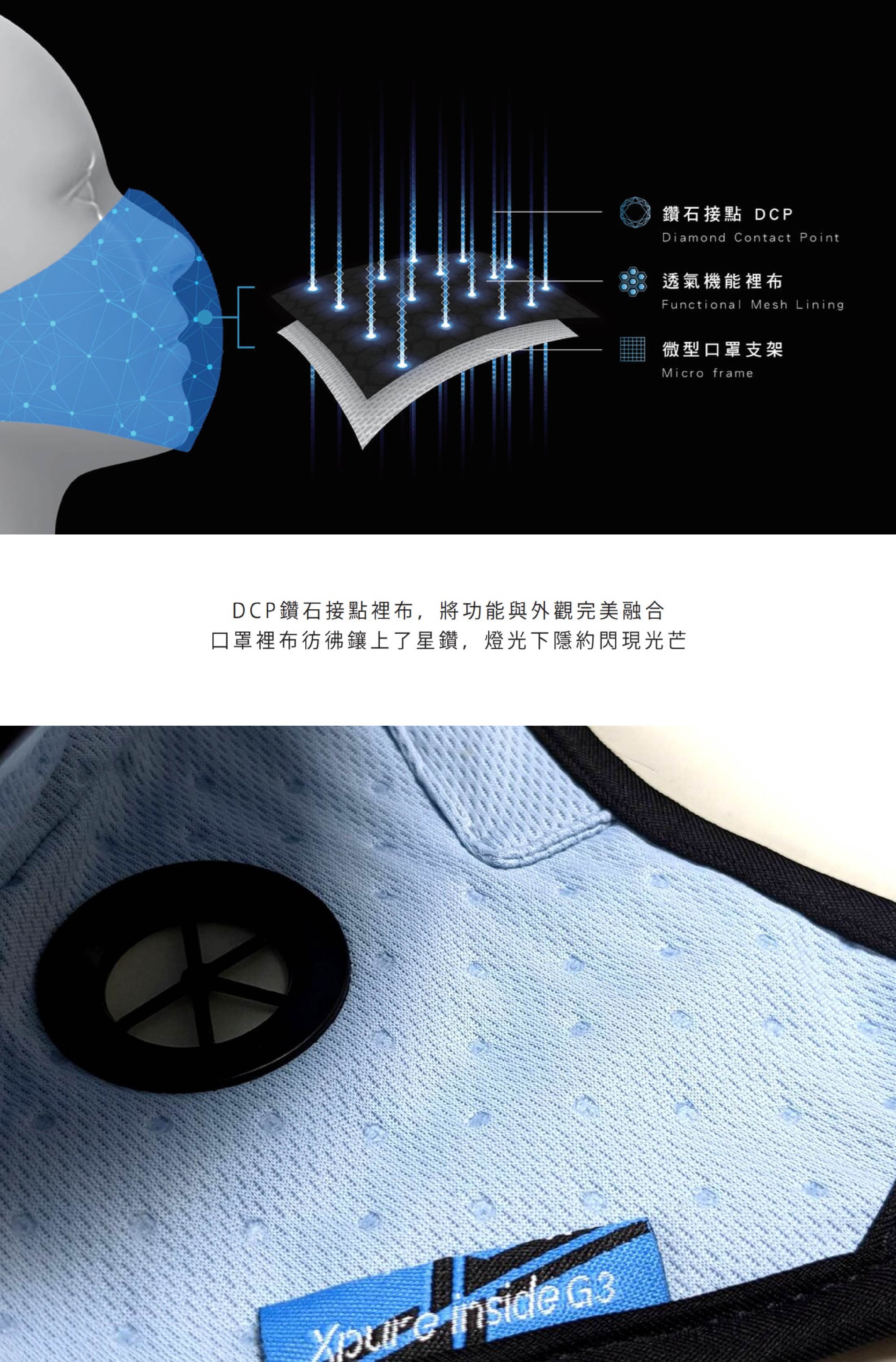 Urban G3、All-fit G3、Beauty G3、Athlete三款目前使用Xpure奈米防護層G3,過濾效果最高(CNS15980 A級),最耐水洗,並且有最低的呼吸阻抗。而其餘款式除了Basic款使用G1濾材,其餘皆使用Xpue奈米防護層G2,通過CNS15980 B級,過濾效果也是很好。另外,不論G1、G2、G3都同樣能承受水洗200次,並且在一般情境下使用都是很足夠的。