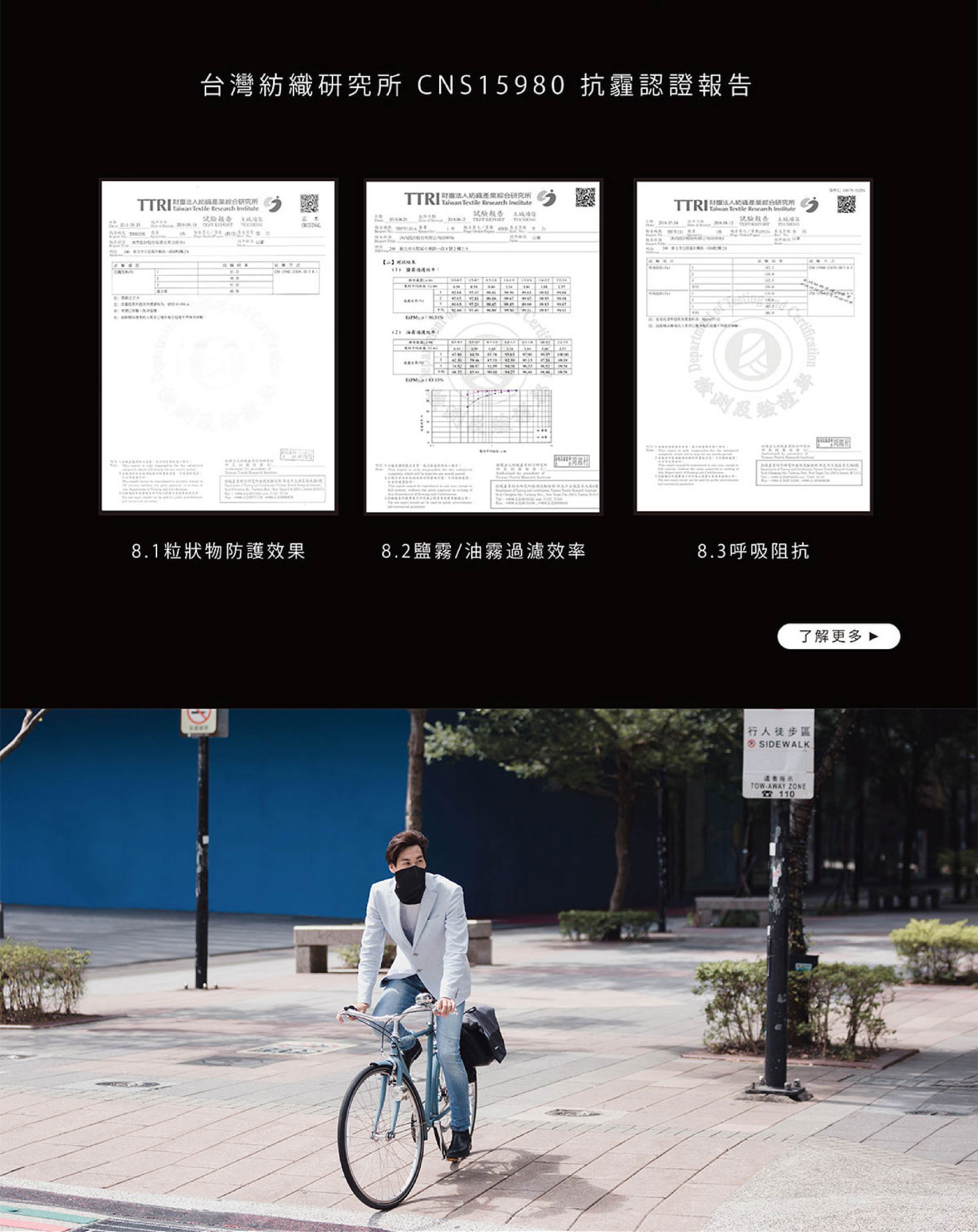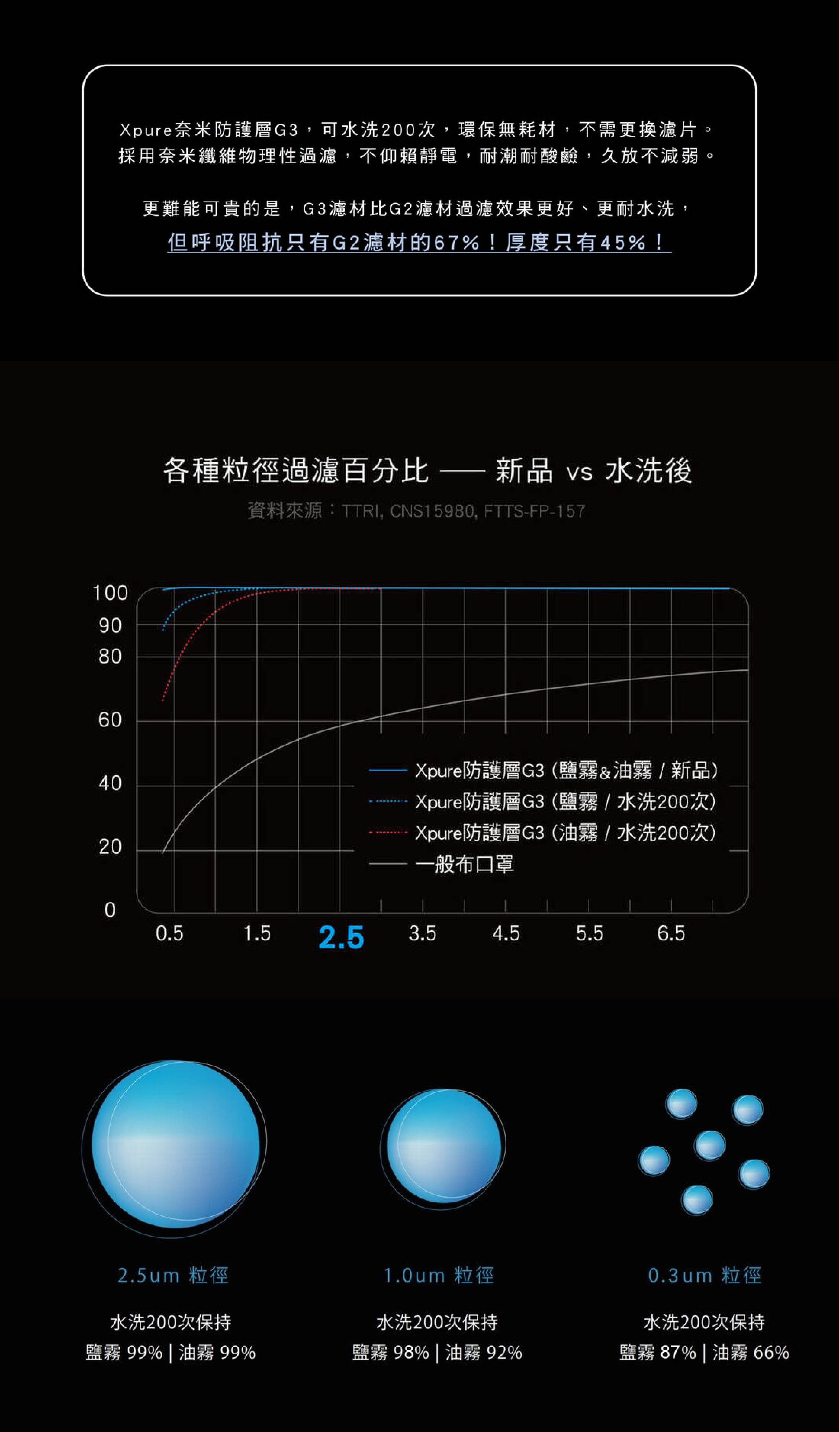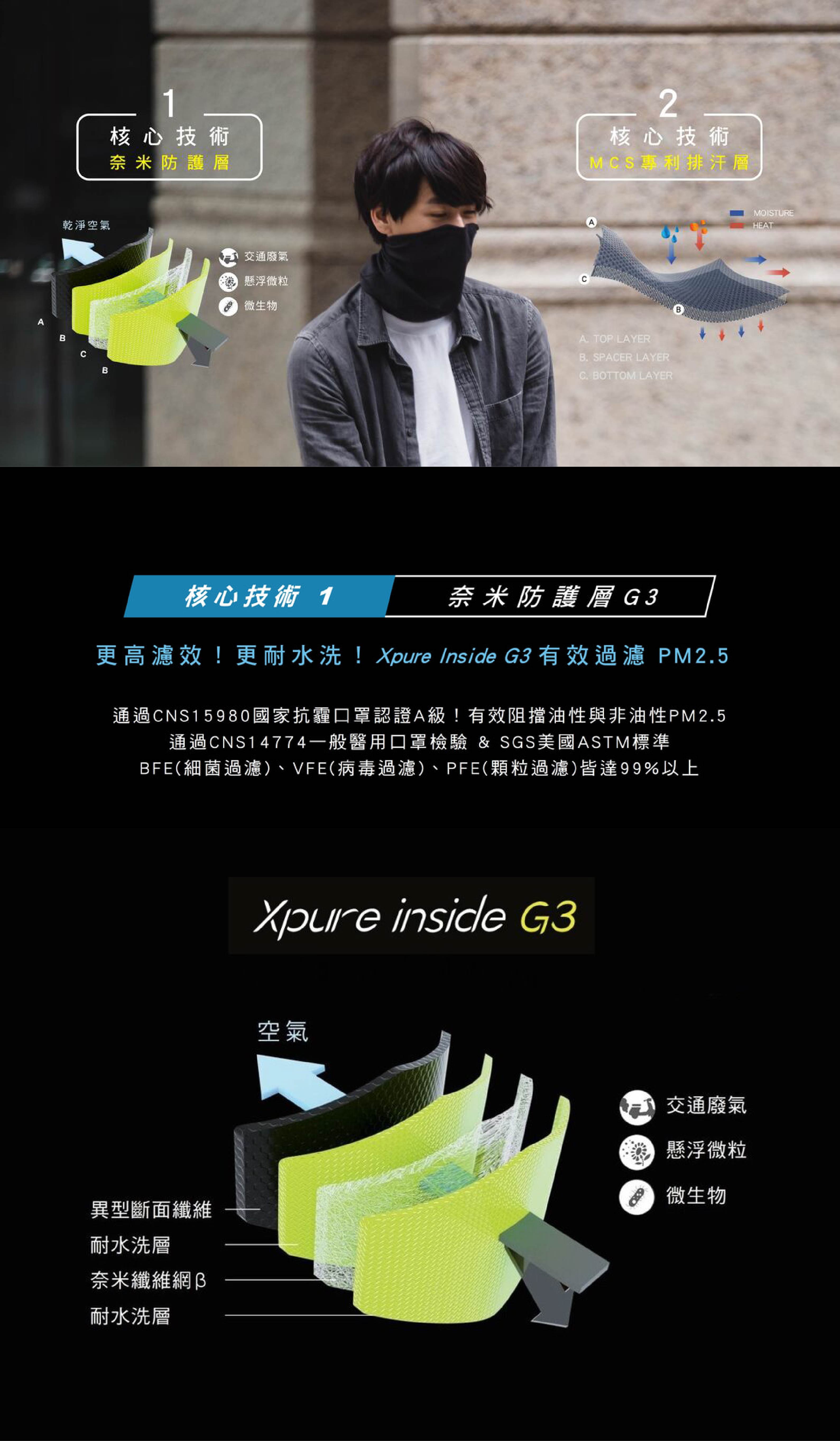 極黑款V3.0的濾材使用最新一代的「Xpure inside G3」,比抗霾魔術頭巾V1.1 (G1濾材)、V2.0 (G2濾材)的濾材都更好。G3濾材通過CNS15980 A級,為抗霾認證最高等級,且更耐水洗,呼吸阻抗也更低。