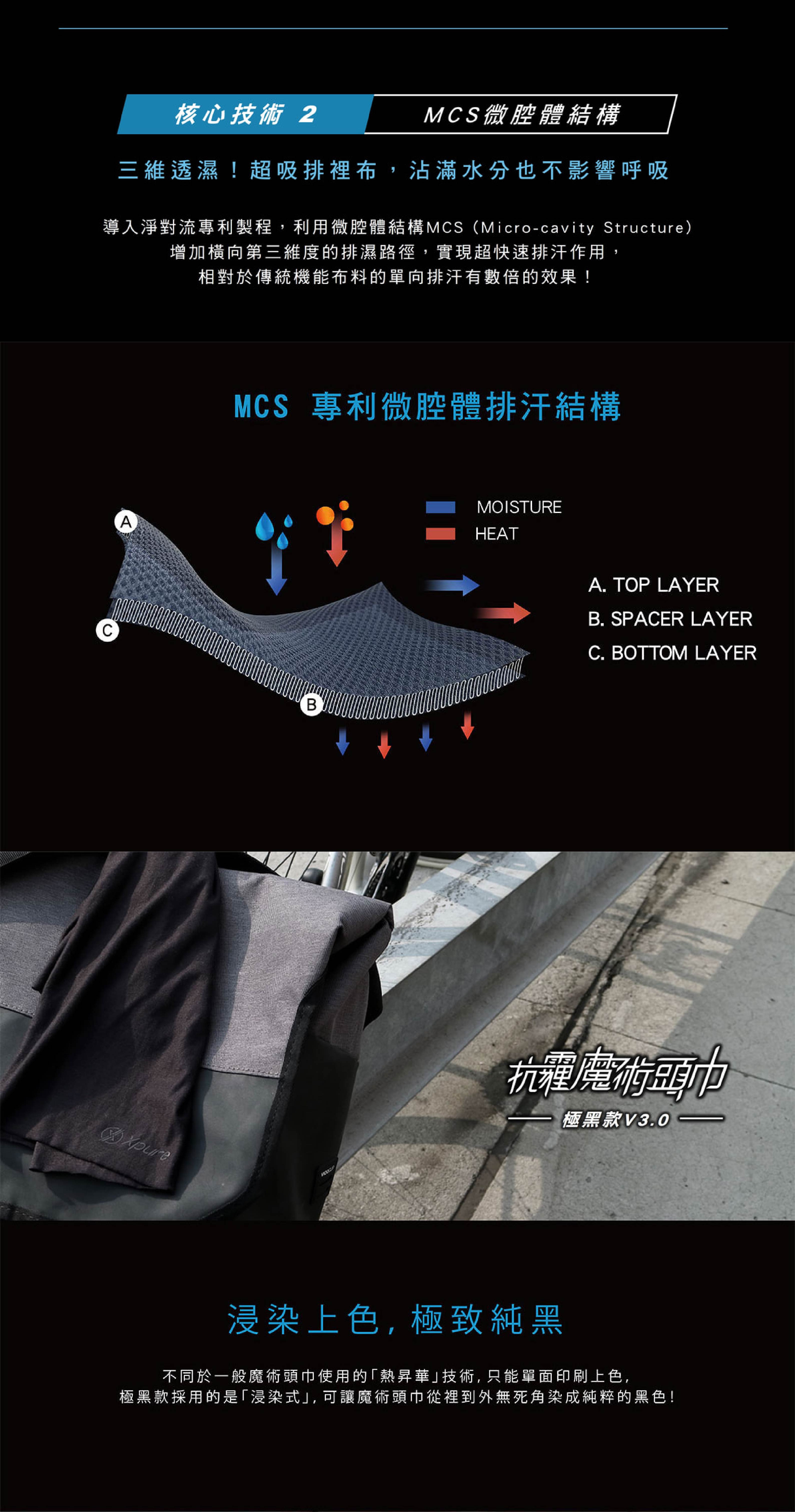 黑色的確較易吸熱,但因為頭巾的面積遠小於衣服與褲子,所以並不會對體感溫度造成決定性的影響。換句話說,如果天氣很熱,你穿著深色衣服,這時戴淺色或黑色的魔術頭巾,是感覺不太出來差異的。另外,極黑款也採用了美國杜邦的Coolmax布料,吸濕排汗又透氣,能有效平衡因為黑色造成的蓄熱效應。