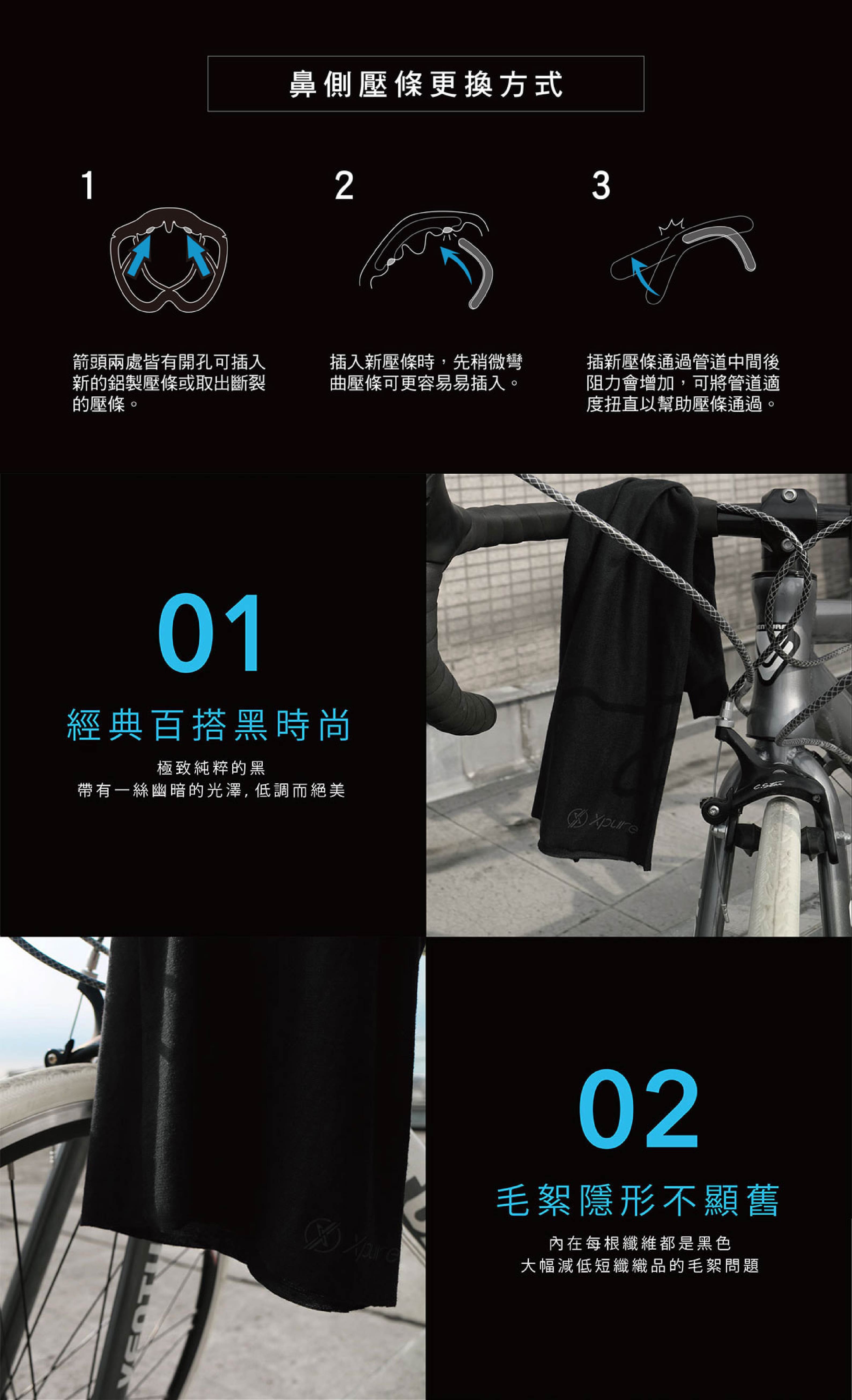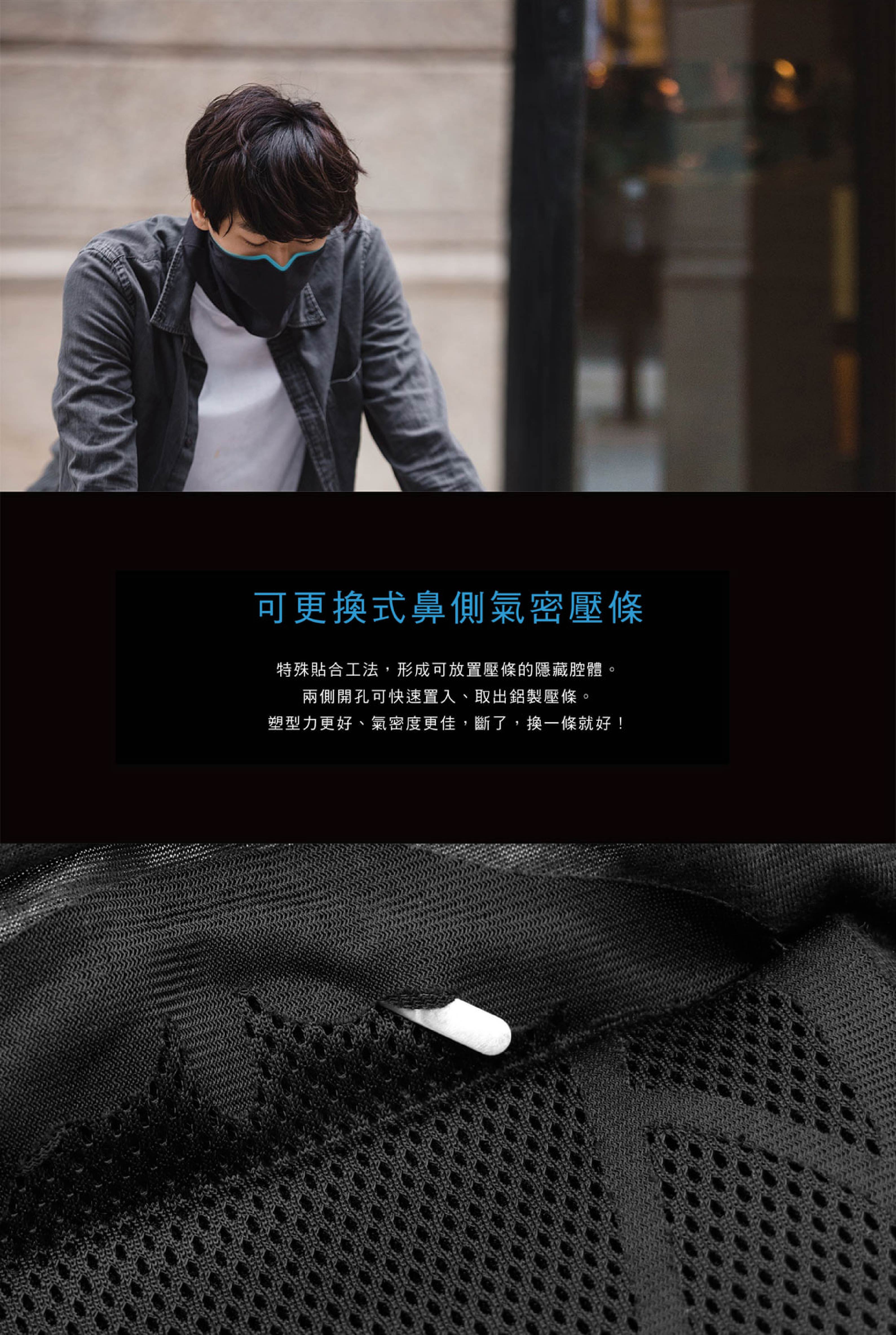 - 極黑款V3.0的鼻樑處有內嵌塑形壓條,是市售唯一「可以替換壓條」的設計。氣密性更好,耐用度更佳。斷了,換一條就好。