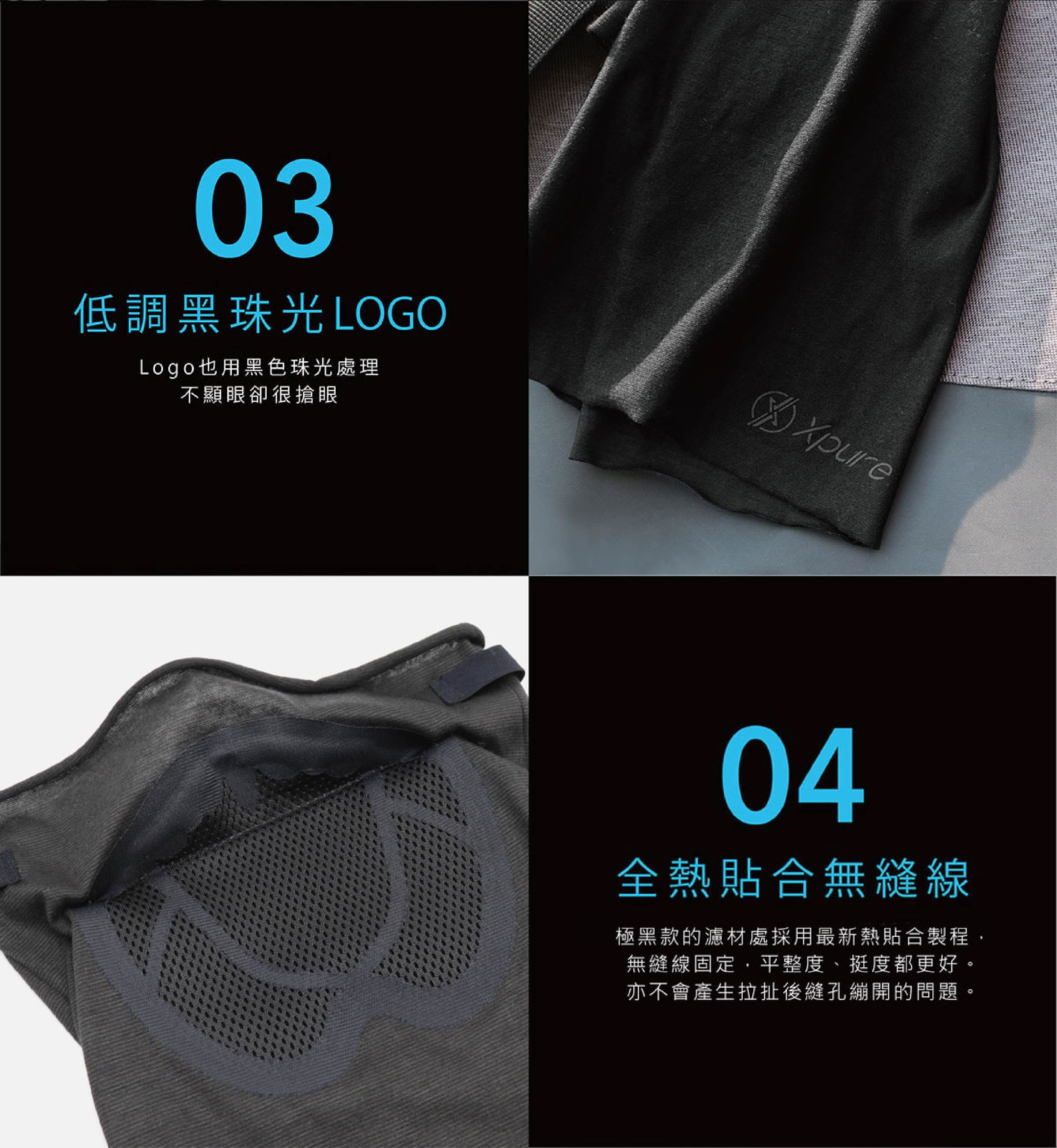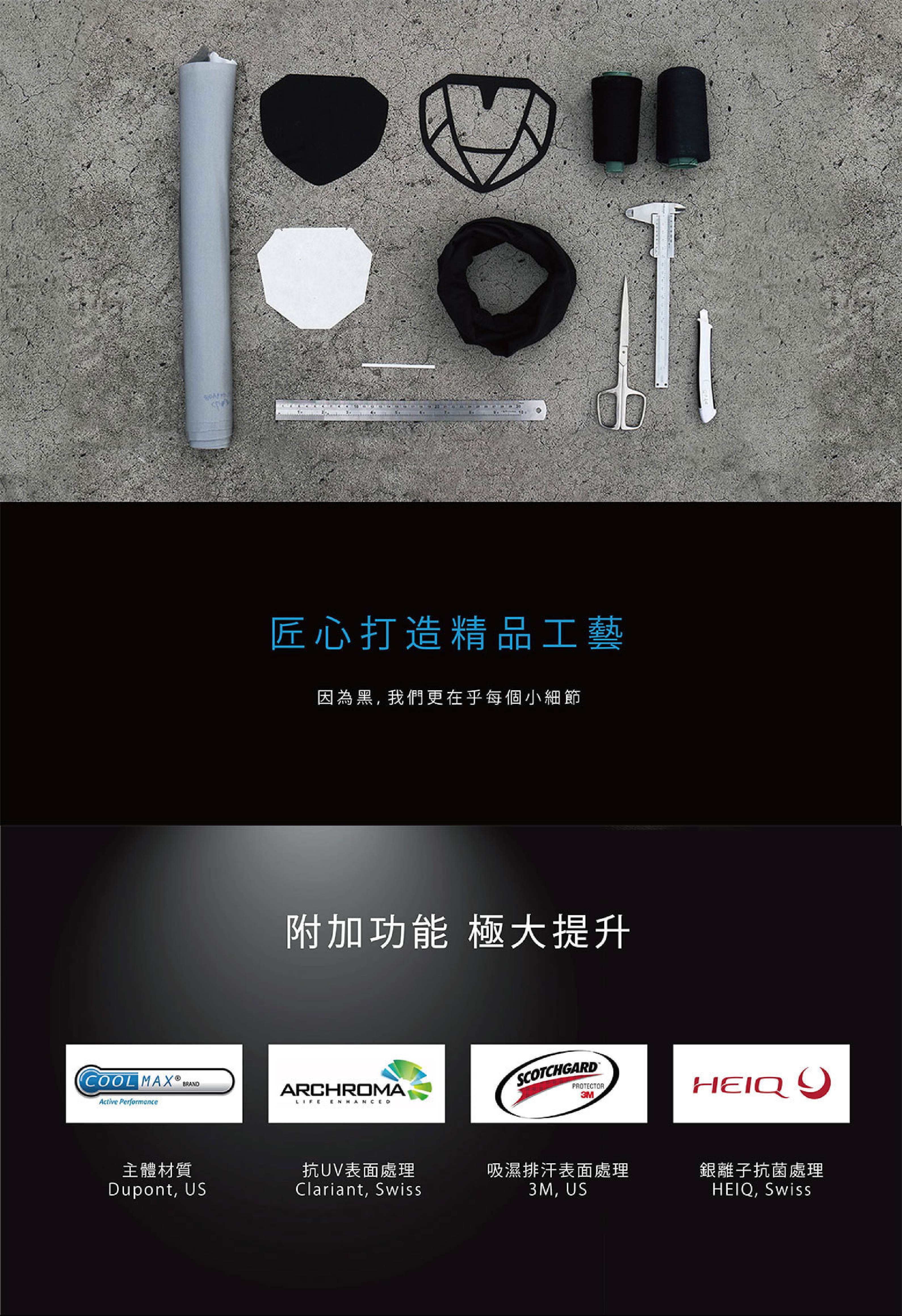 - 極黑款的奈米防護層採用熱貼合技術與頭巾結合,外型平整,細緻美觀,且不會有拉扯後縫孔繃開變大的問題。