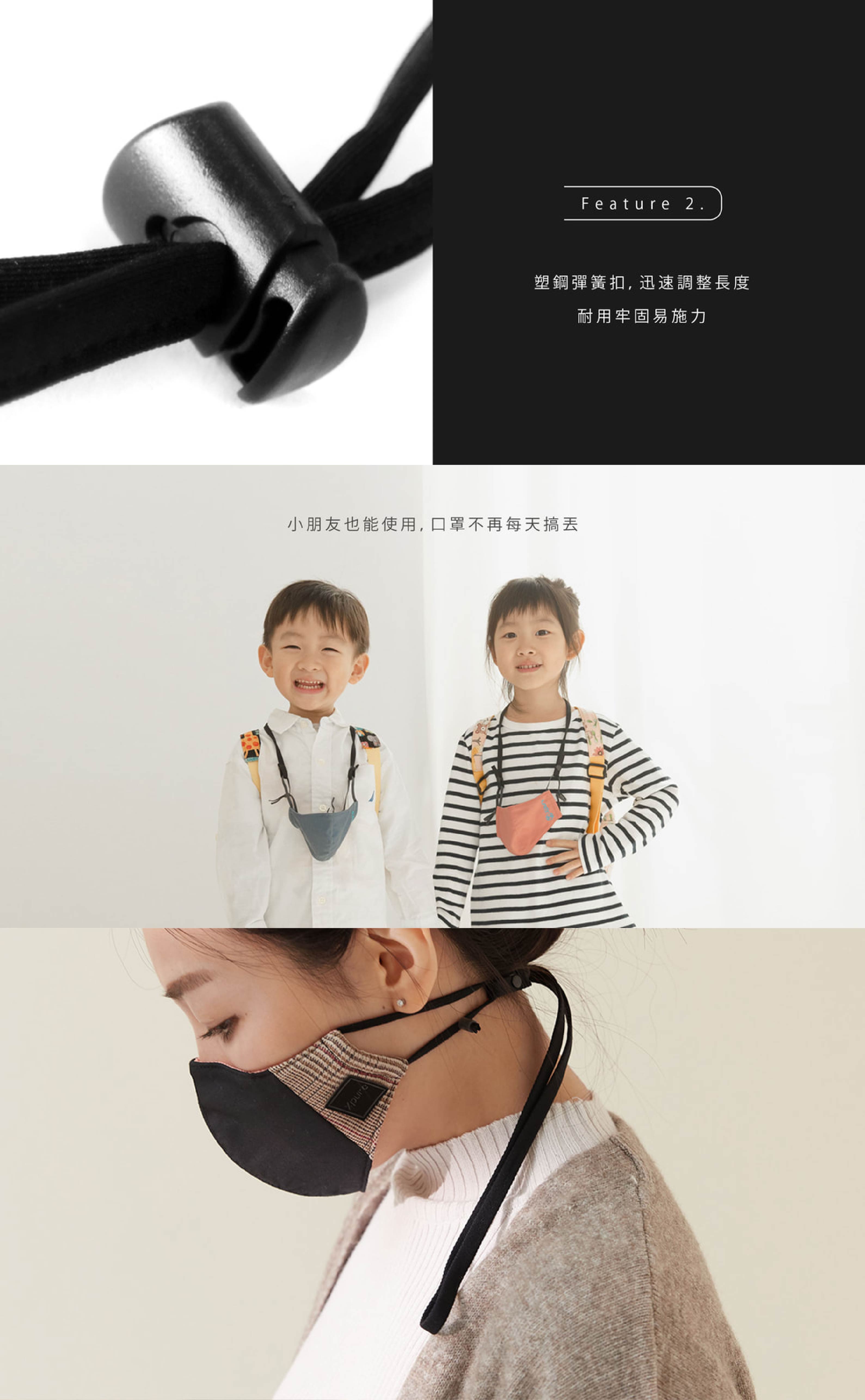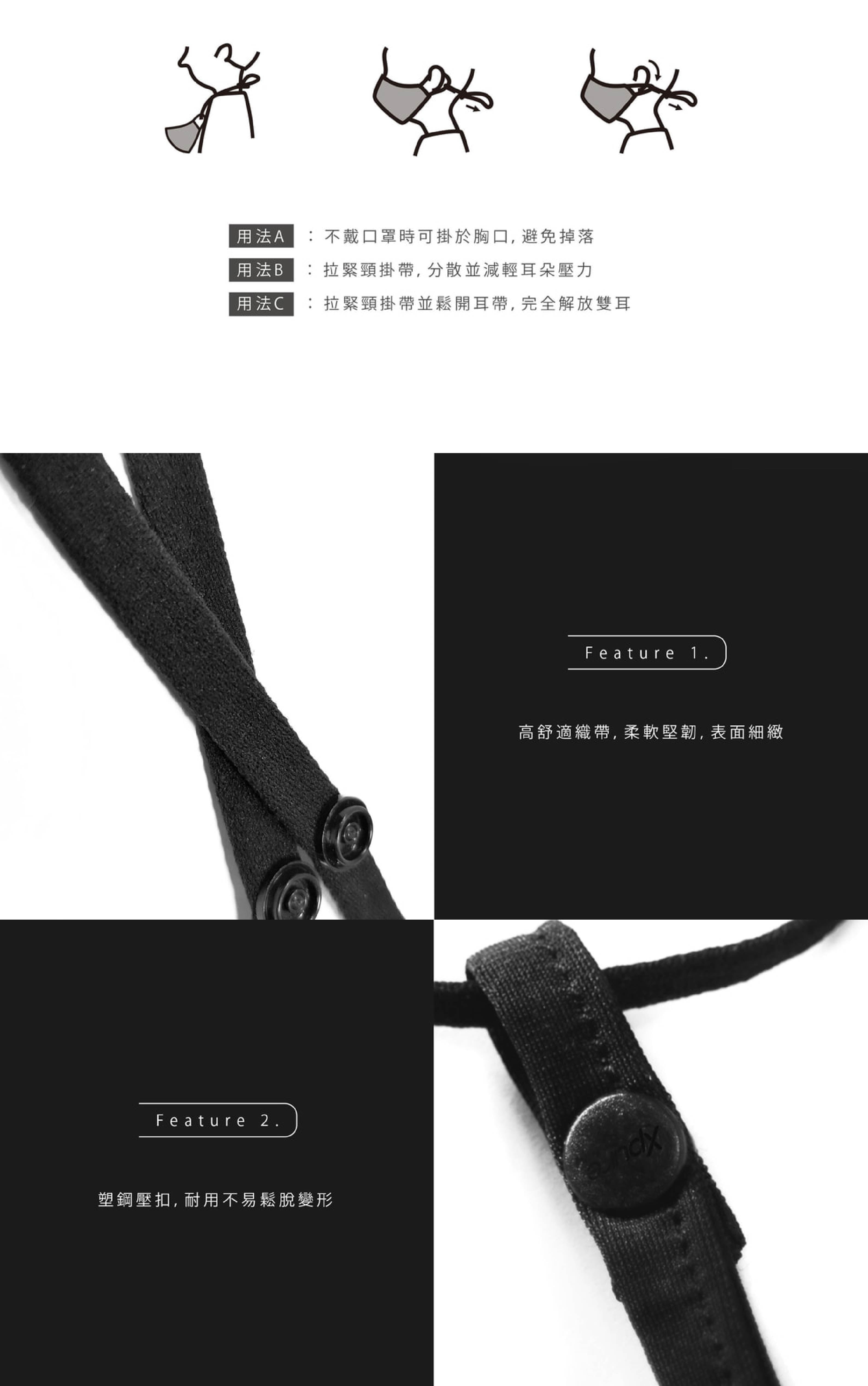 - 口罩暫時不戴時,可掛於胸口,收納方便,避免掉落。
